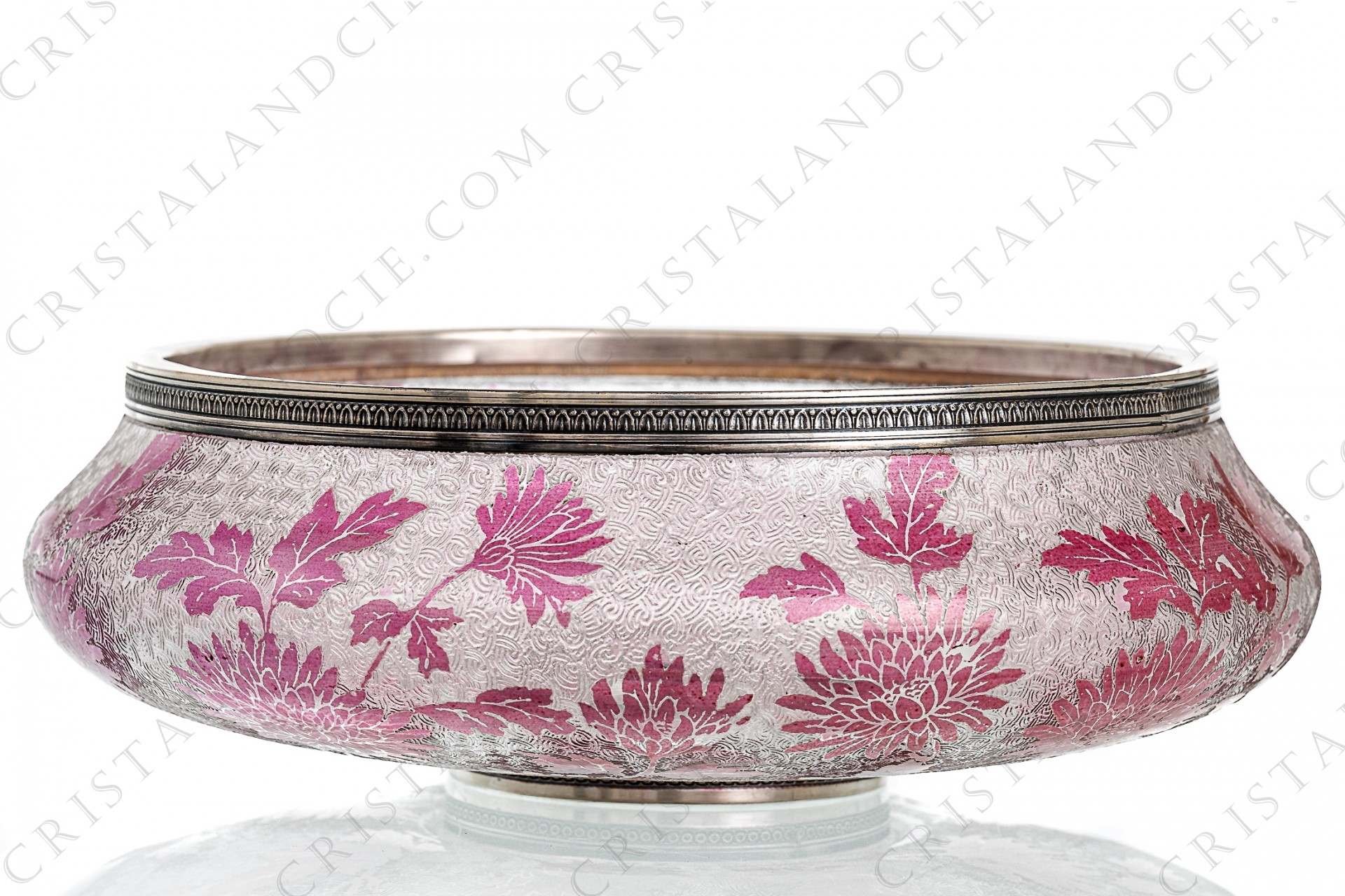 Art Nouveau bowl in pink double layer crystal by Saint-Louis with a pattern of pink dahlias unobstructed acid on an acid etched background in clear crystal. Straps in sterling silver, hallmark Minerve. Dating from the 1900's. Too old to be stamped.
