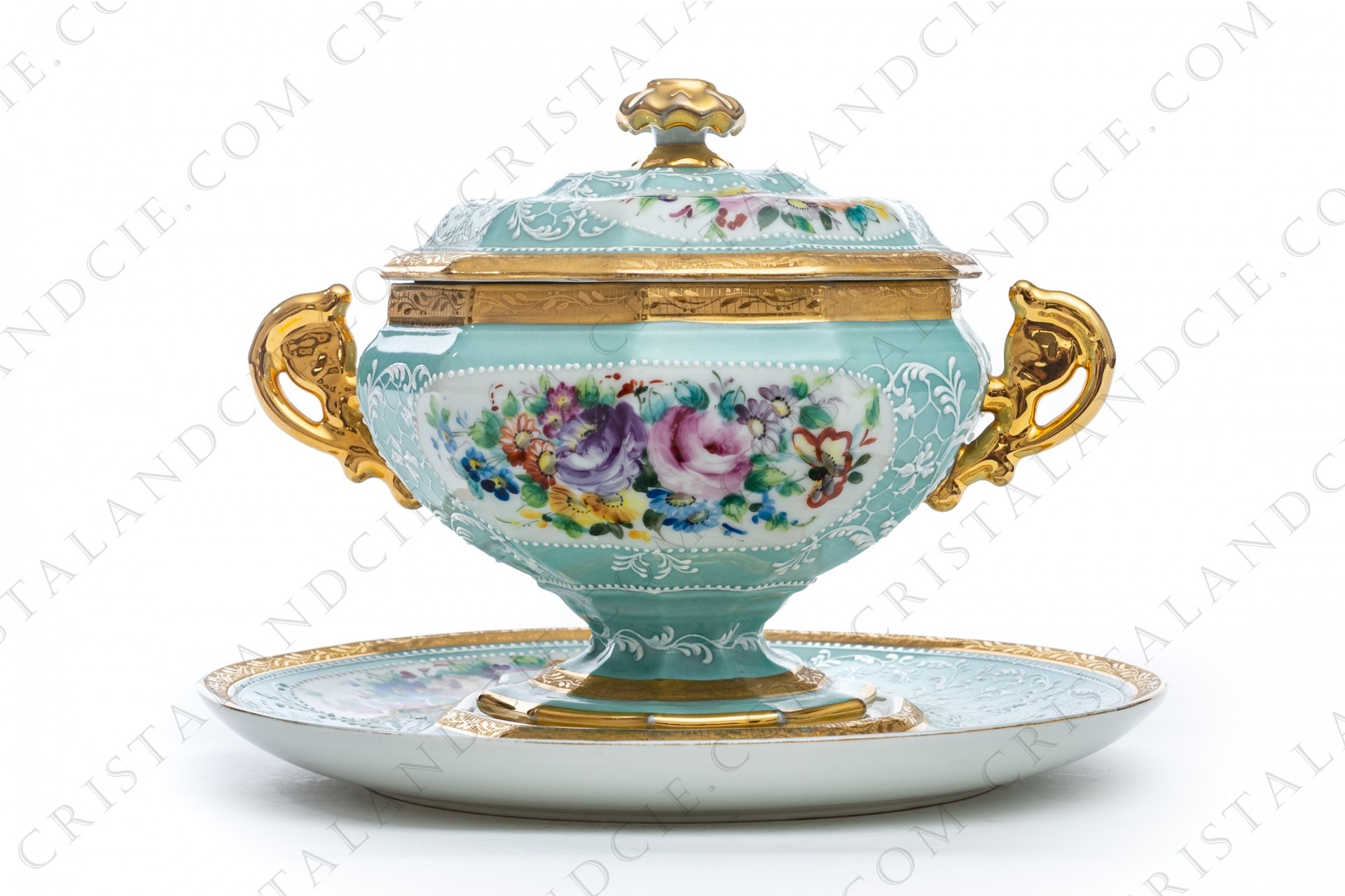Covered jar in Paris china decorated by the workshop Le Tallec with white hand-enameled arabesques on a blue background, and hand painted polychromes flowers. Including the covered jar and its tray. From 1954.