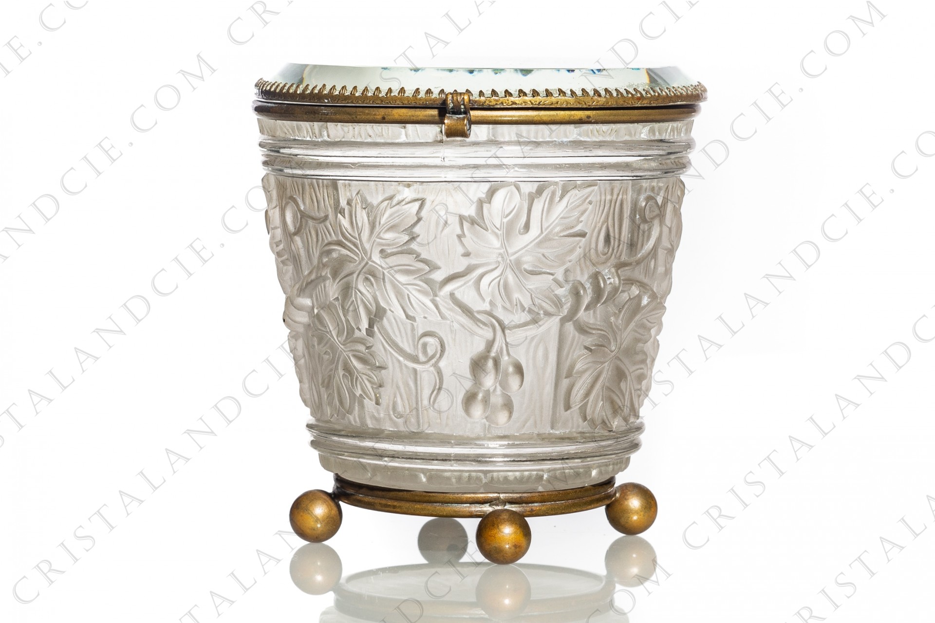 Box in molded, satin and polished crystal by Baccarat decorated with grapevine on a background seems like a barrel. Frame in brass. From the second half of the 19th century. Signature in the mold.