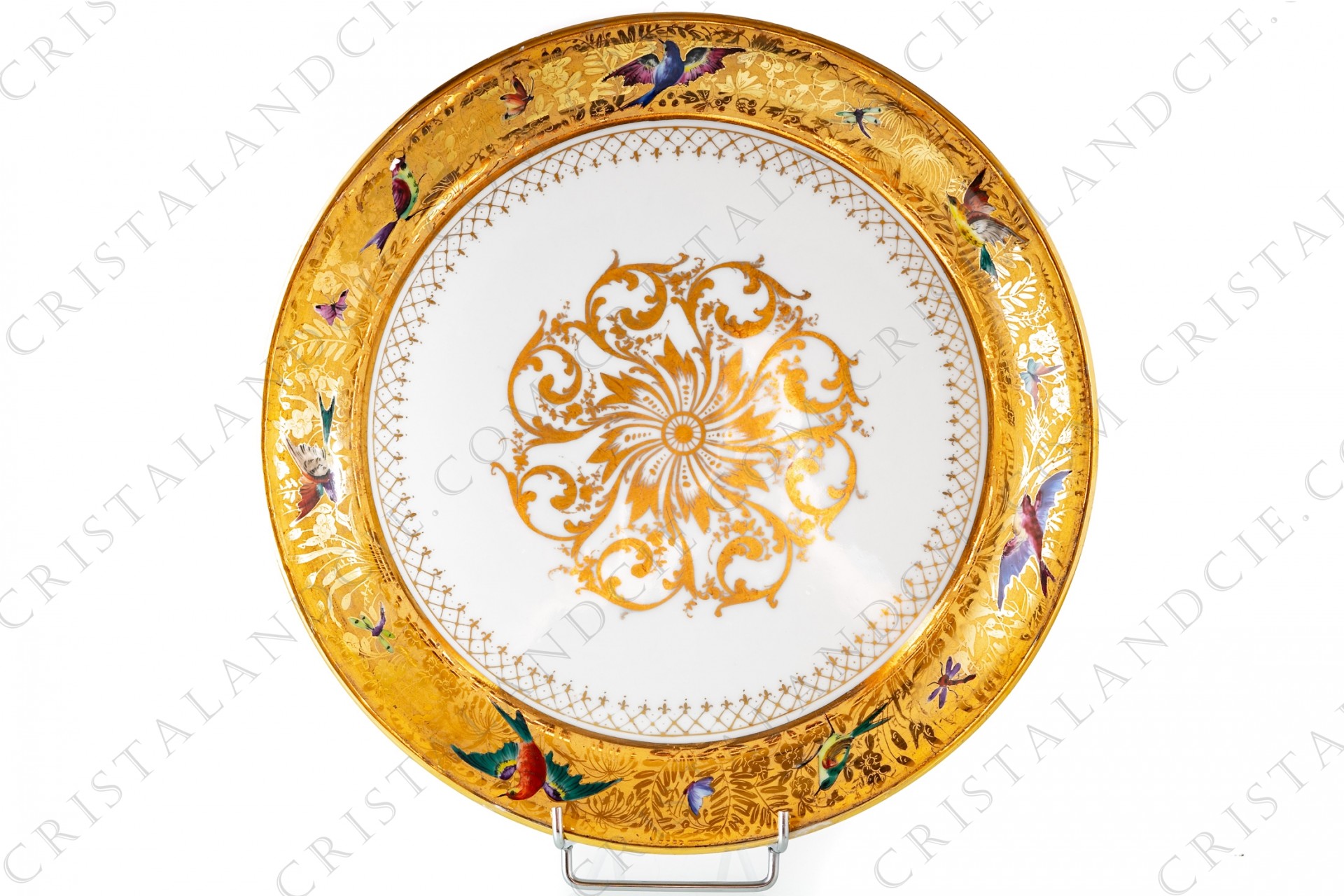 Cake dish in china hand painted by the workshops Le Tallec, decorated with polychromes enameled birds of paradise and butterflies on a gold flowered stripe. The inside of the dish is decorated with gold arabesques. Dating from 1952.
