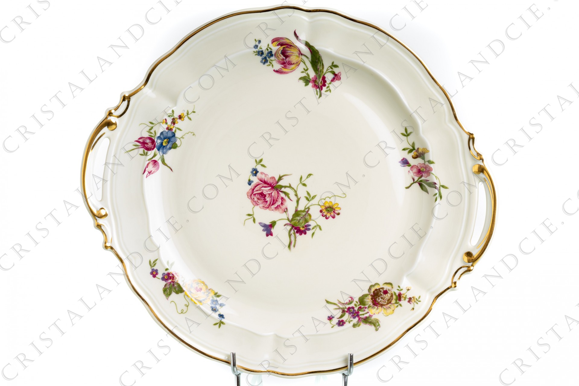 Cake dish in Limoges china by Bernardaud shape Régence decorated with polychromes flowers.
