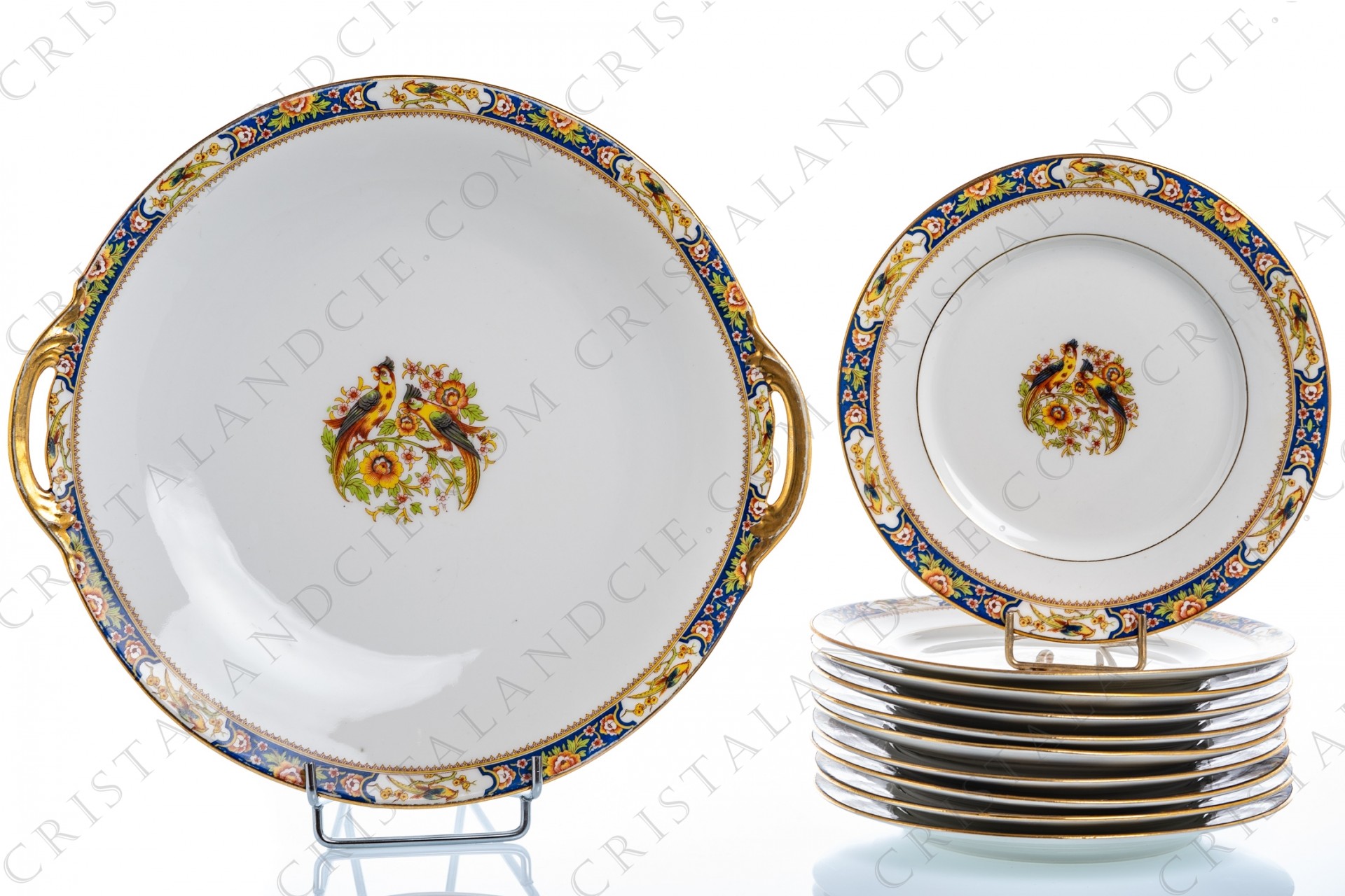 Cake set in Limoges china decorated with a couple of polychromes parrots on flowered branches. Frieze of birds of paradise and flowers on the periphery. including a dish and ten plates.