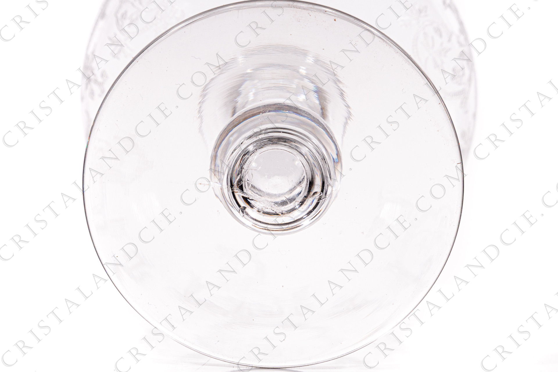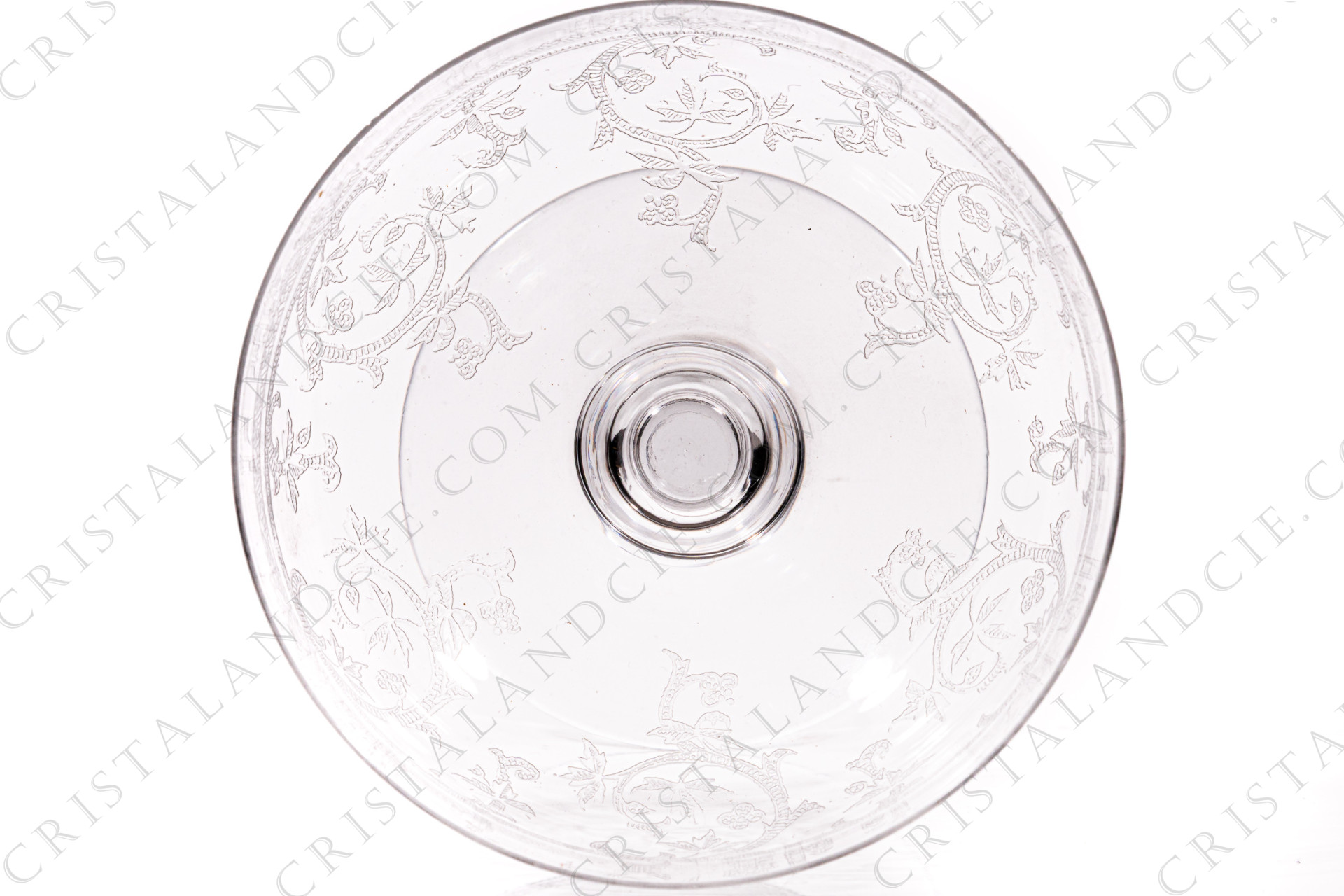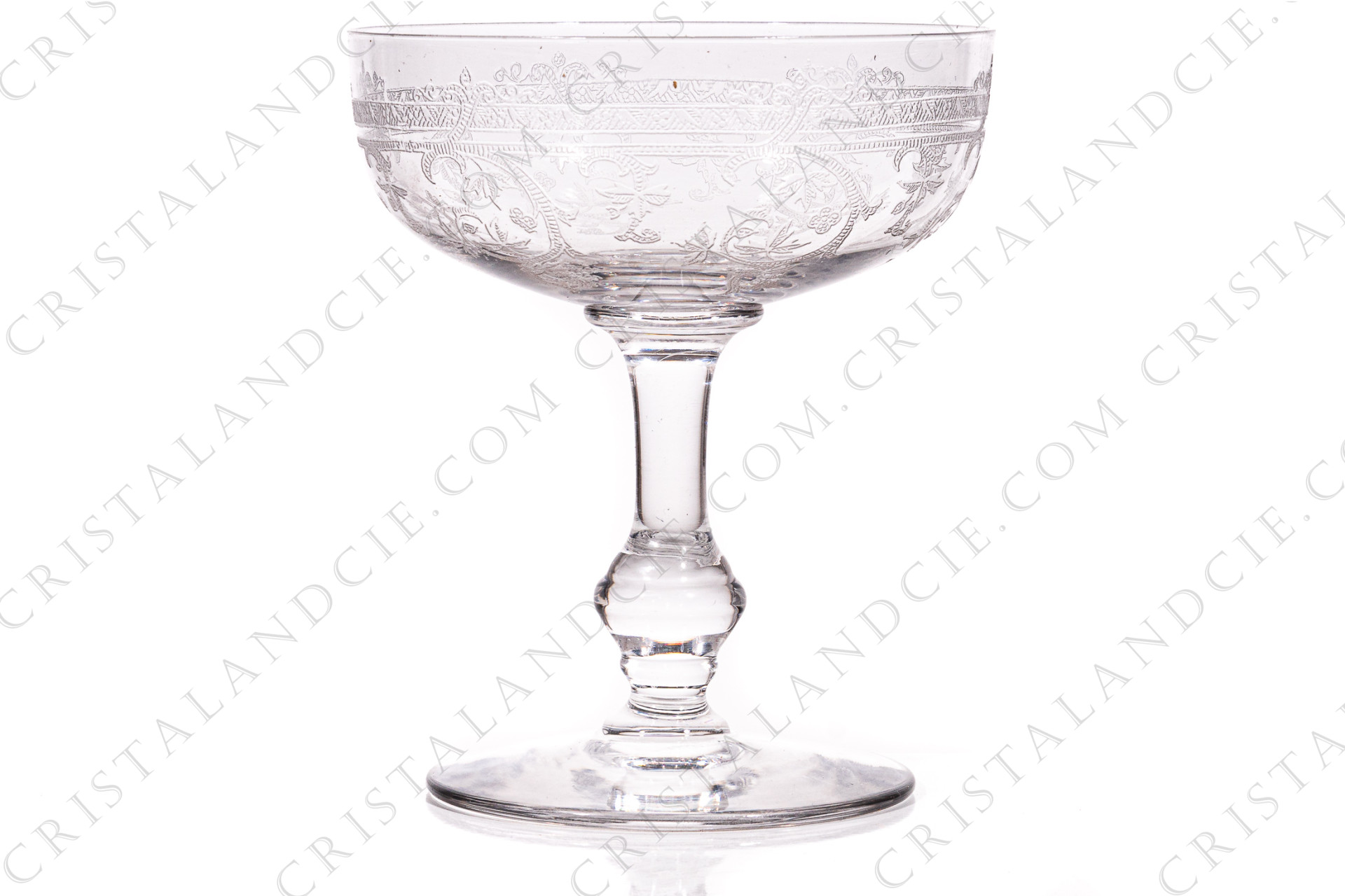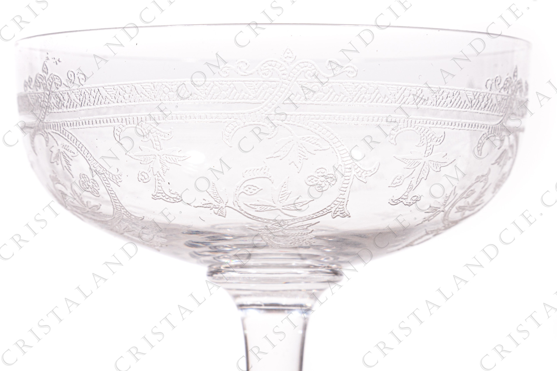 Champagne saucer in crystal by Saint-Louis pattern Metz with an engraved pattern of vegetable arabesques. Dating from the 1930's. Too old to be stamped. Referenced in the catalogue Services de table of 1930.