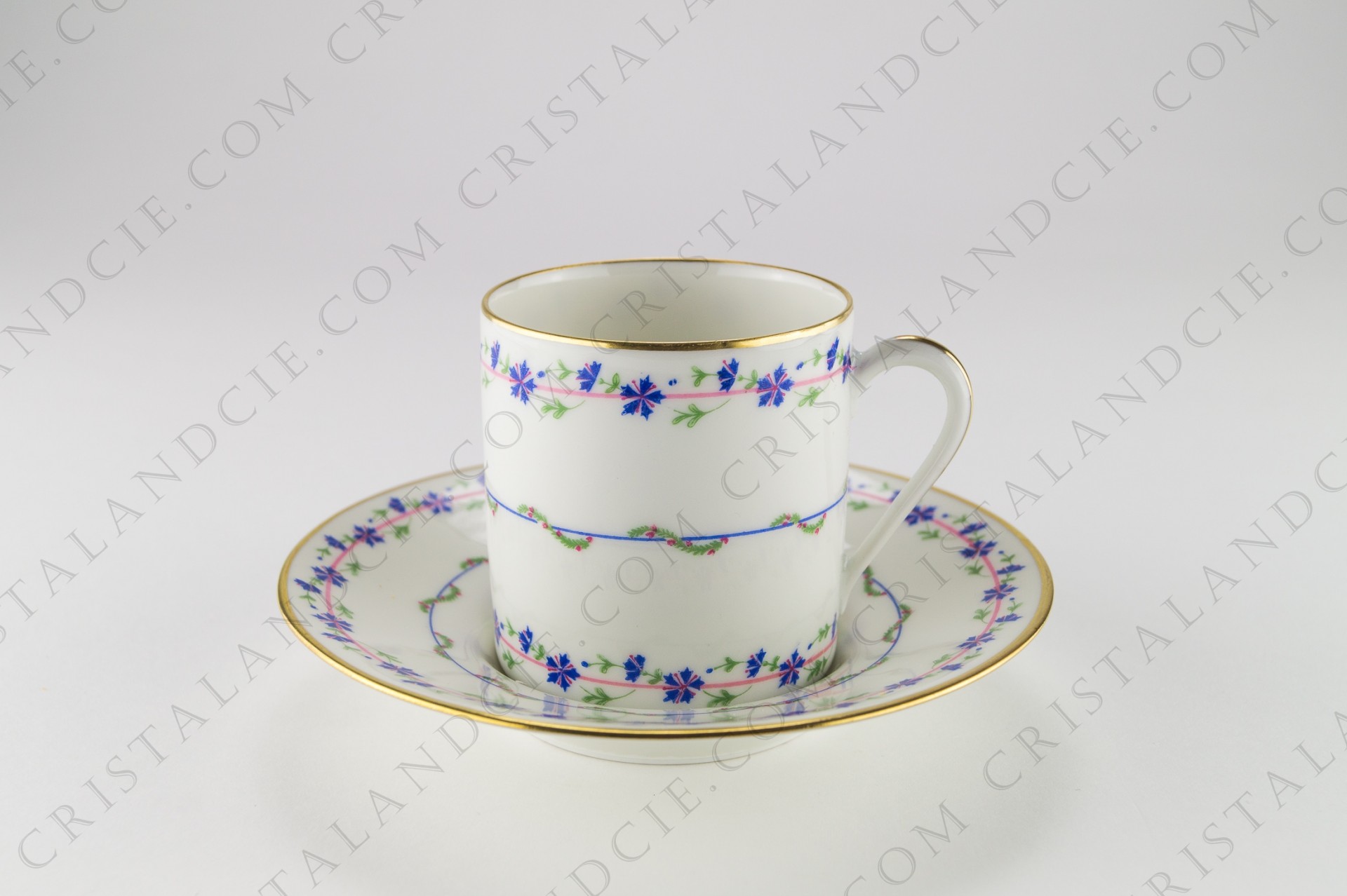 Coffee cup in Limoges china by Raynaud pattern with cornflowers,decorated with cornflowers and gold borders, a rose in the bottom of the cup and of the saucer.