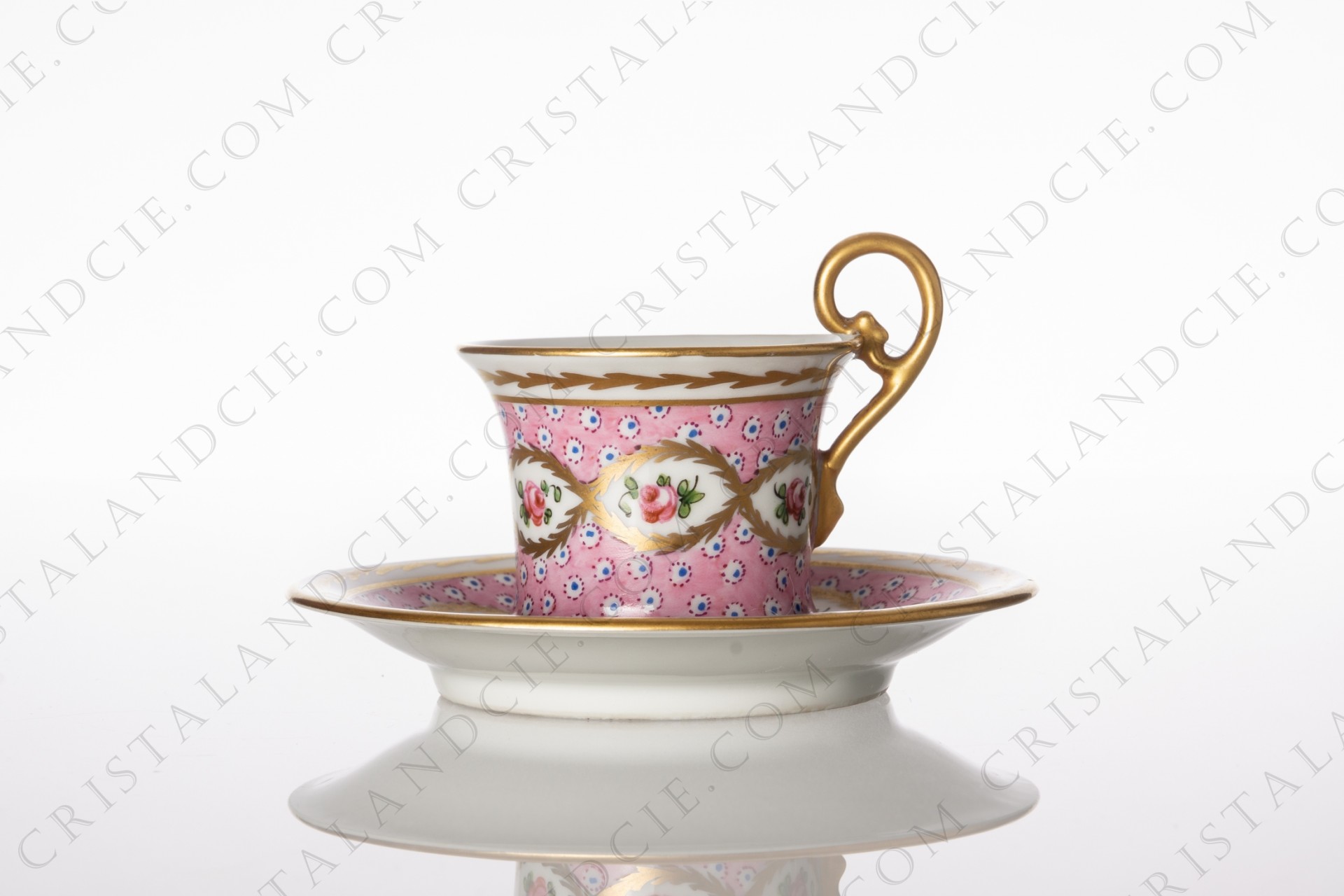 Coffee cup in Sevres china with a hand painted pattern of roses on a pink background gold enhanced.
