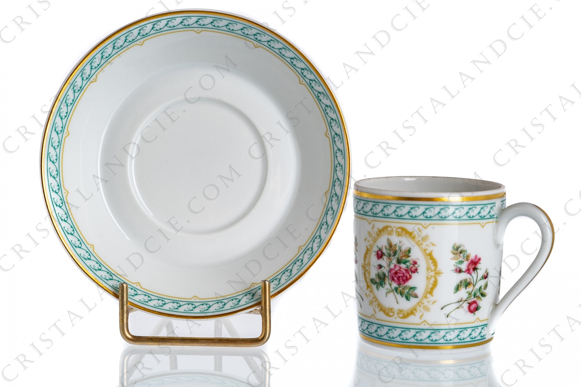 Coffee cup in Limoges china by Haviland collection Empress Josephine pattern Rose d'Amour, decorated with polychromes roses and with green and gold friezes and borders. Pattern created in 1982.