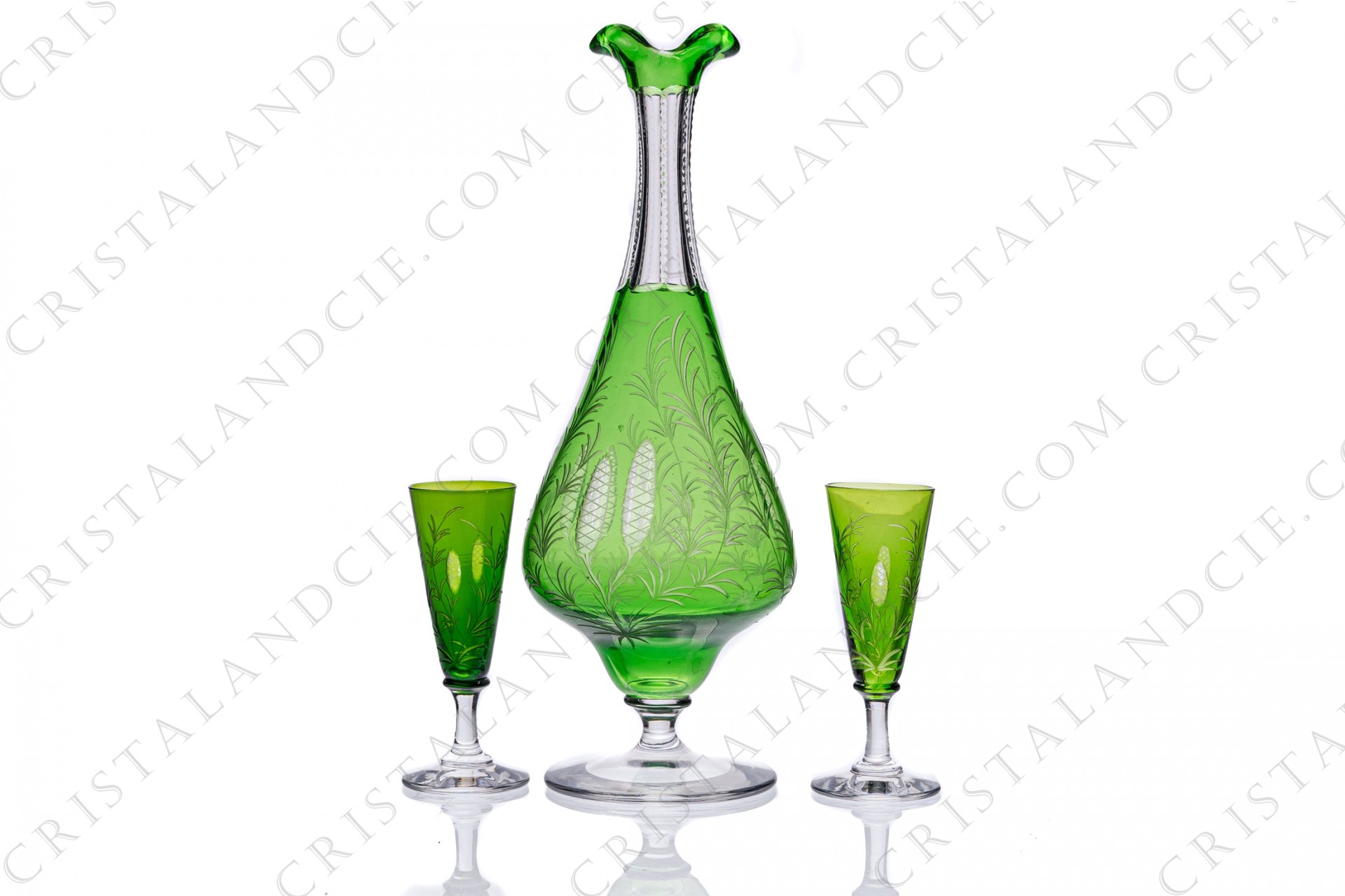 Cordial set in green double layer crystal by Saint-Louis with an engraved pattern of pine tree and pine cones. Including a decanter and two glasses. Dating from the 1930's. Too ols to be stamped.