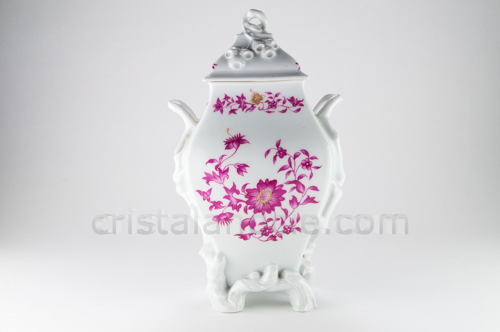 Covered vase in Limoges china by Bernardaud decorated with pink flowers. The base and the handles are represented as branches.