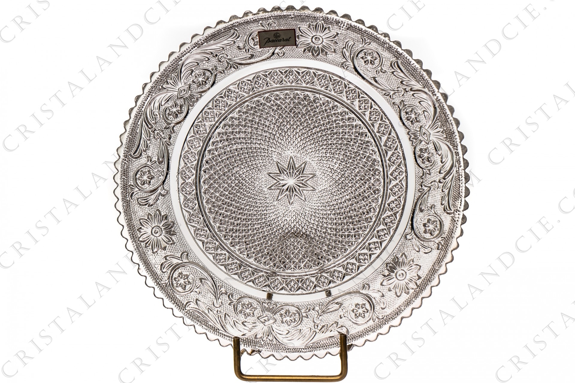Dessert plate in molded crystal by Baccarat pattern Arabesque decorates with diamond tips, stars and leafy and flowered arabesques. Stamped, sticker Baccarat. Sold in its original box. Excellent condition. Diameter: 6,30 in.