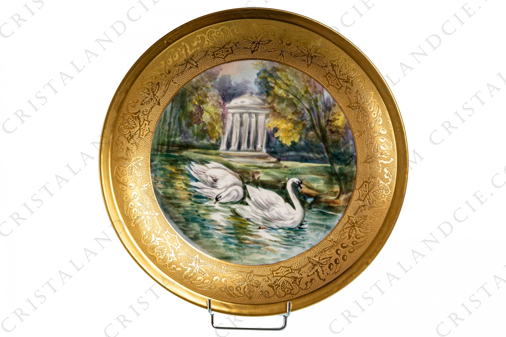 Round deep dish in Limoges china by Theodore Haviland presenting in a hand painted pattern of two swans and an ancient temple in a lakeside landscape its center and a large plant frieze in gold inlays. Dating from the end of the 19th-beginning of the 20th century.