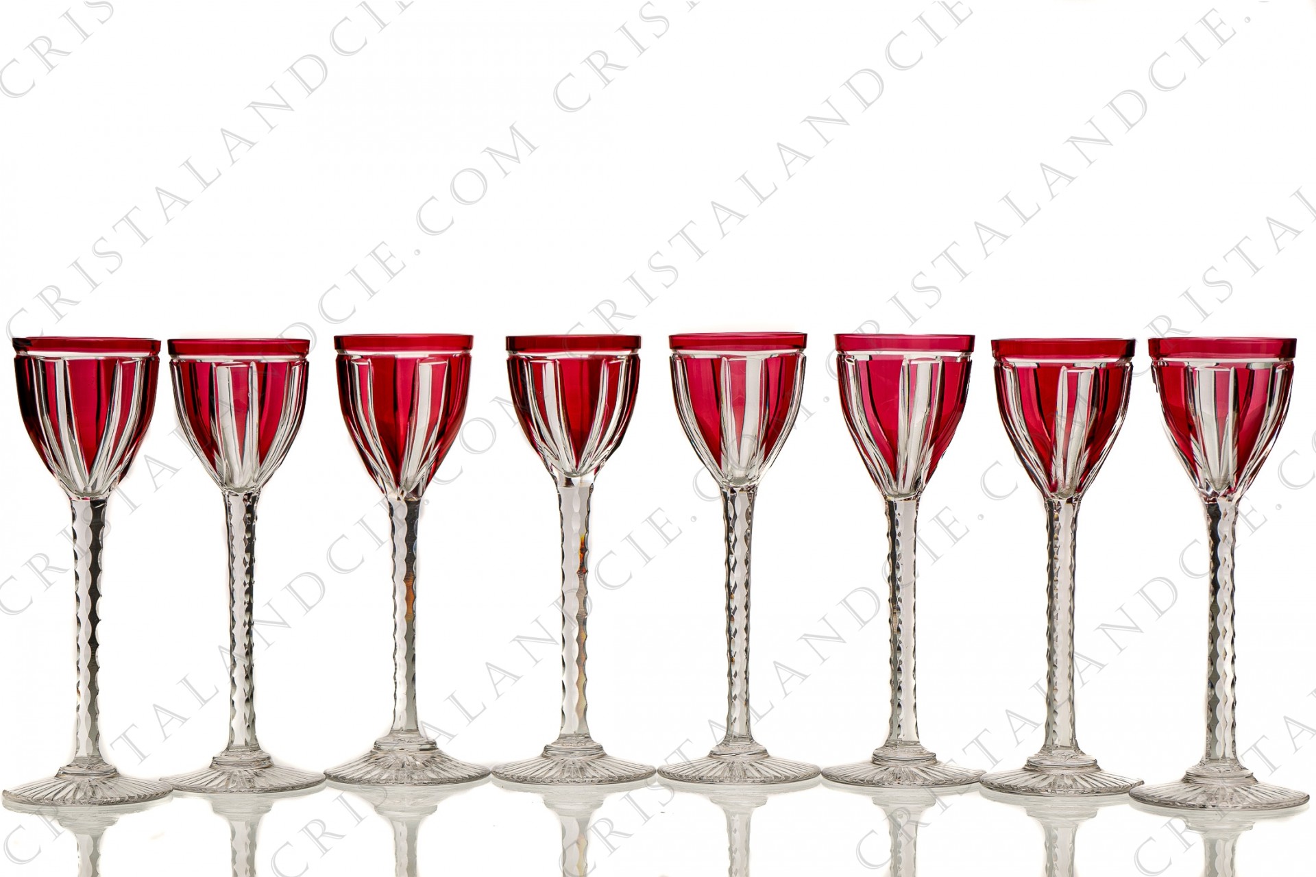 Set of eight cordial glasses in red double layer crystal by Saint-Louis with a cut pattern. Dating from the 1930's. Too old to be stamped.