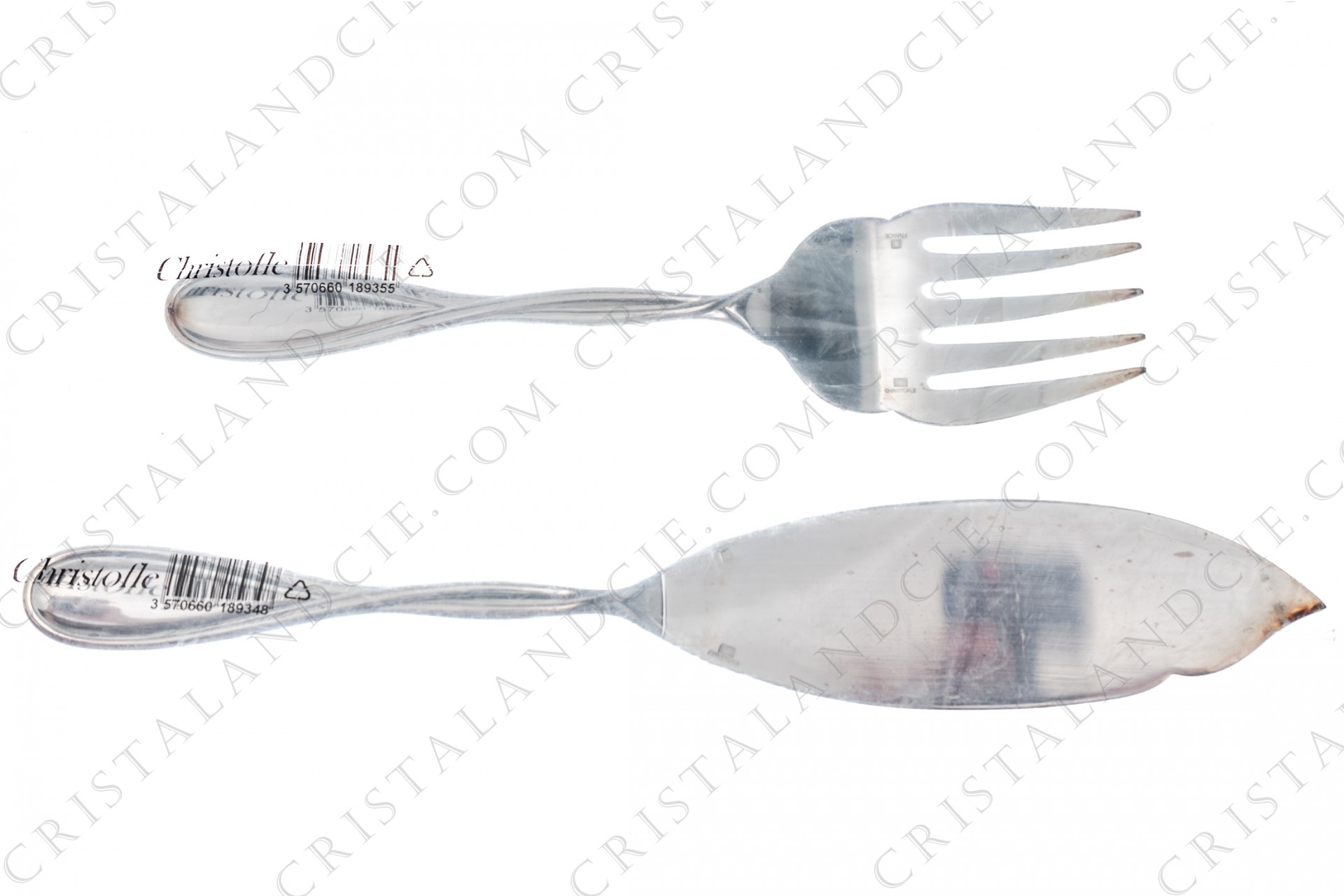 Fish serving flatware in plated silver by Christofle pattern Galea with a twisted handle. Including a fork and a knife.