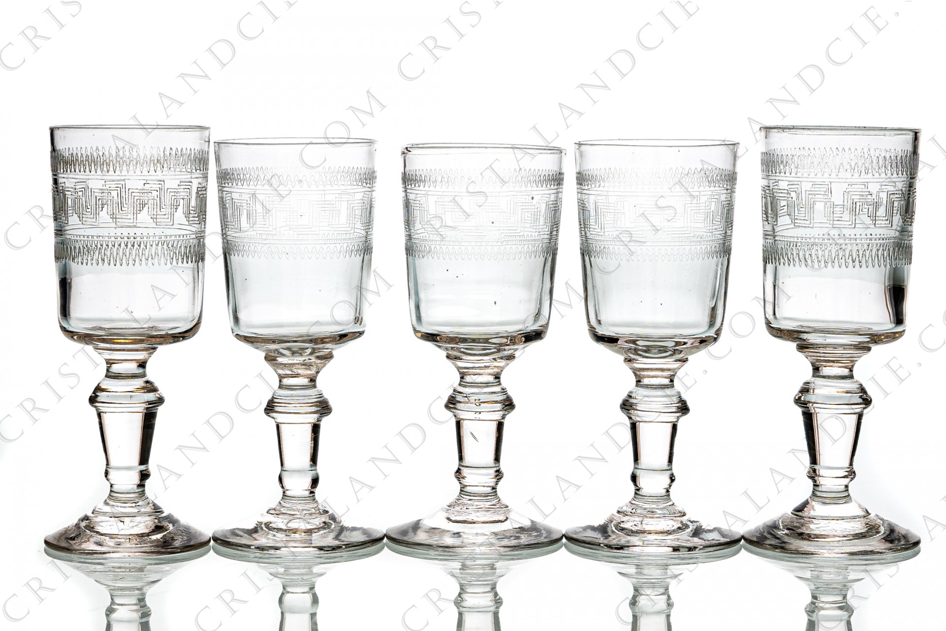 Set of five cordial glasses in crystal by Baccarat cylindrical shape with a carved pattern. Dating from the 1910's. Too old to be stamped.