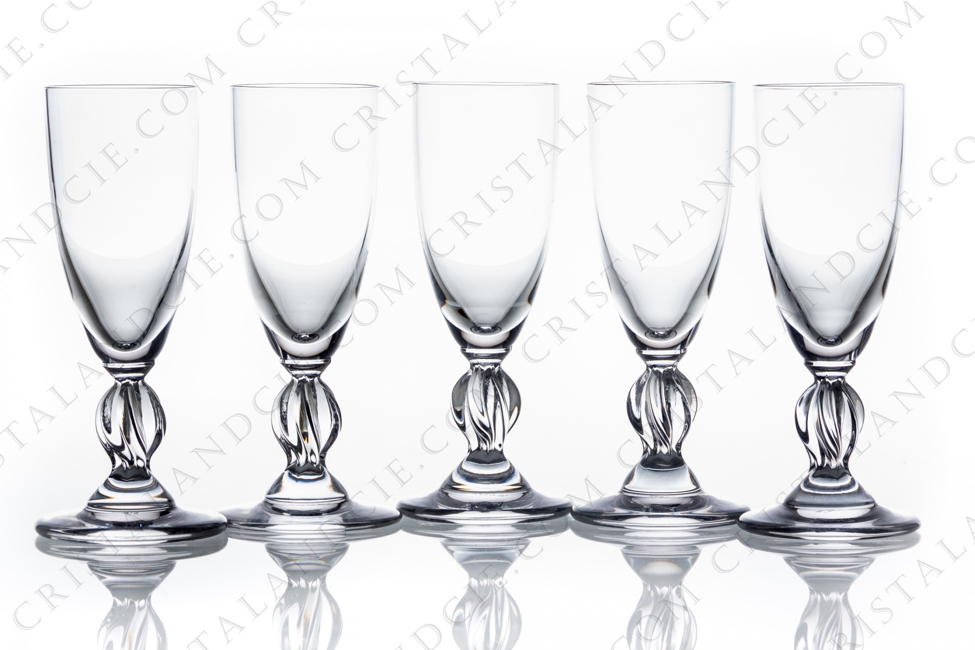 Set of five Cordial glasses in crystal by Lalique pattern Fréjus with a twisted stem. Rares tiny scratches. Height: 4,88 in Diameter: 1,65 in.