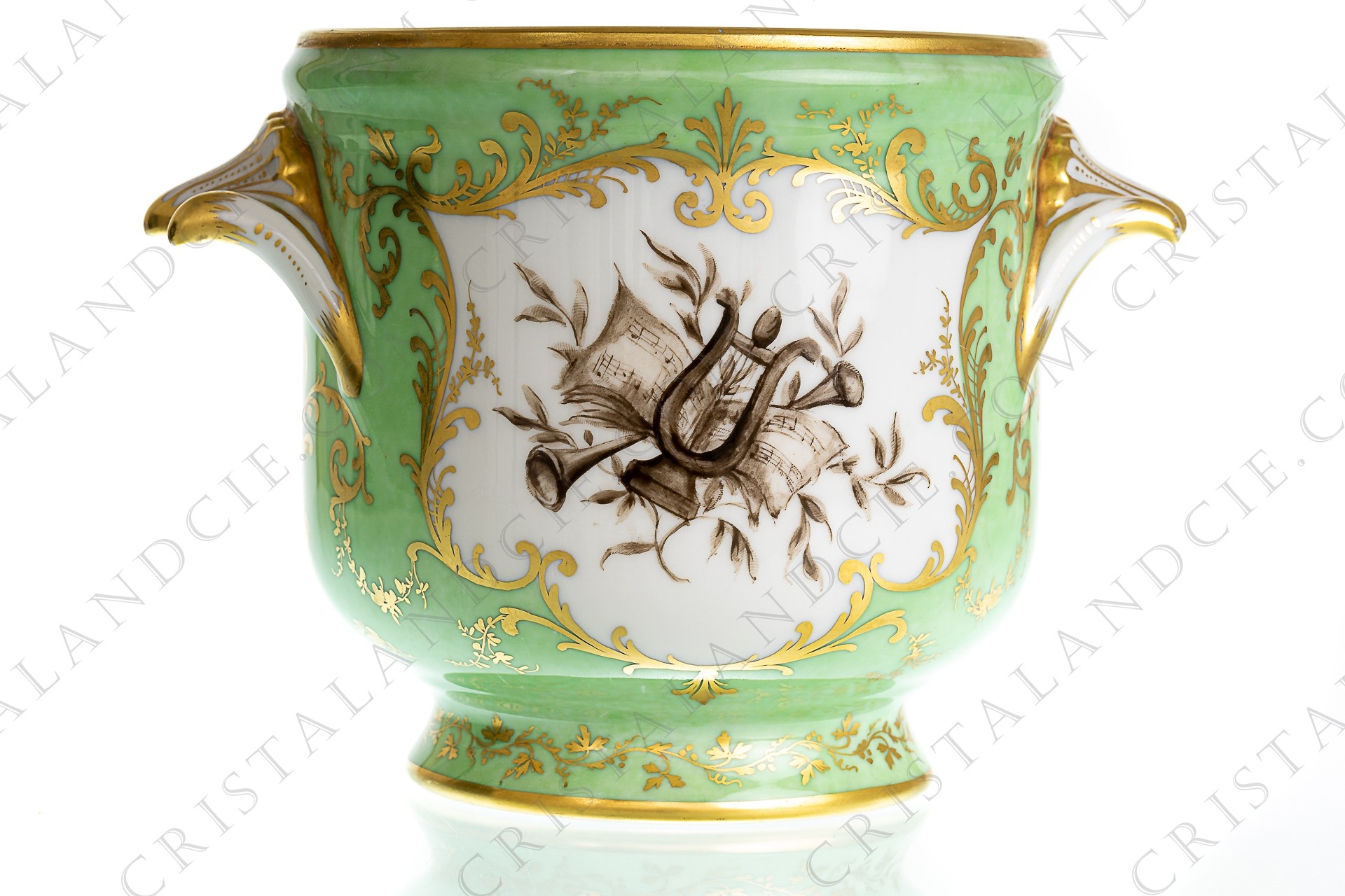 Flower pot in china hand decorated by the workshops Le Tallec decorated with the grey attributs of music and gold arabesque on a clear green background. Dating from 1959.