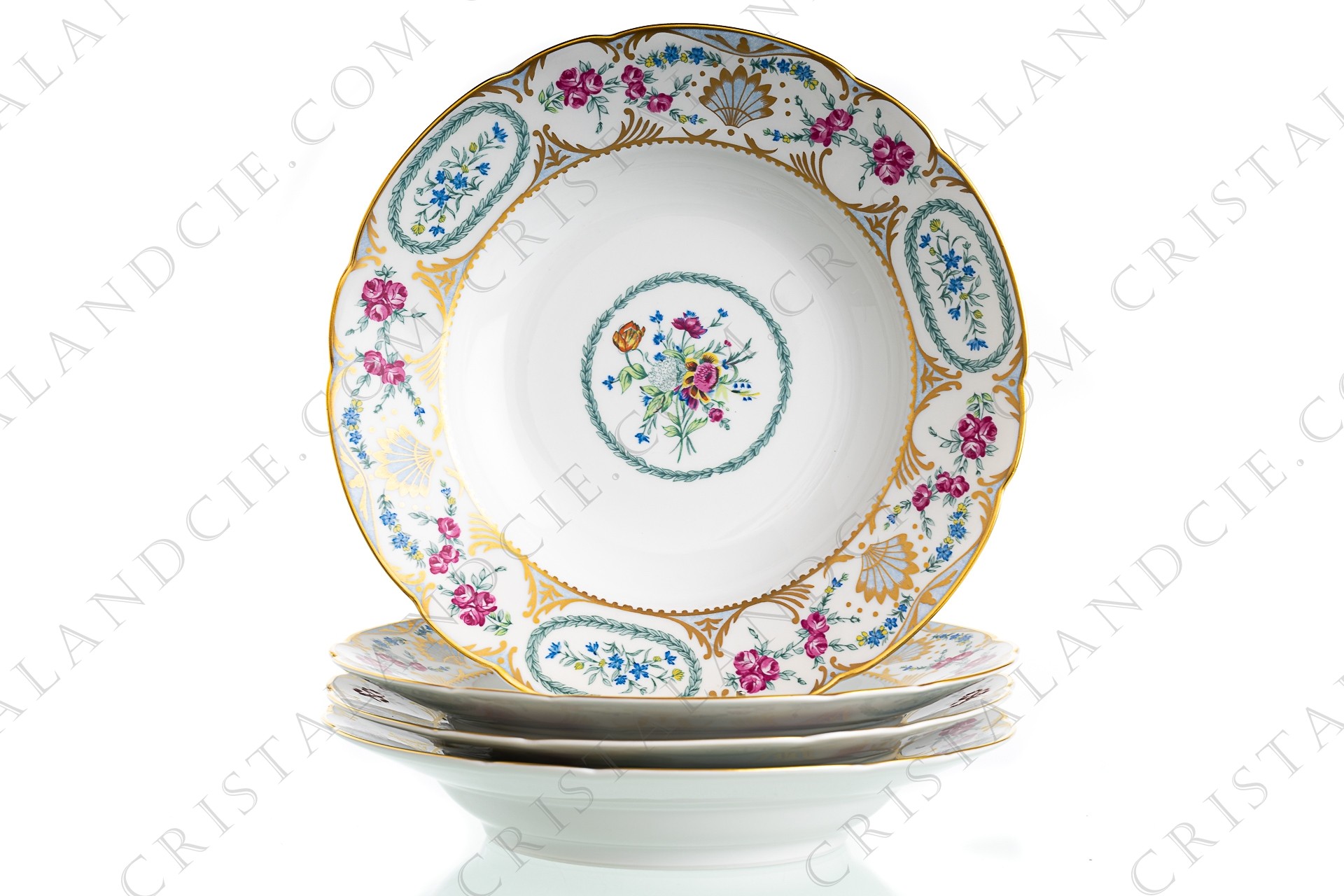 Set of four soup plates in Limoges china by Bernardaud pattern Vigny with an important pattern of polychrome flowers and gold foliages.