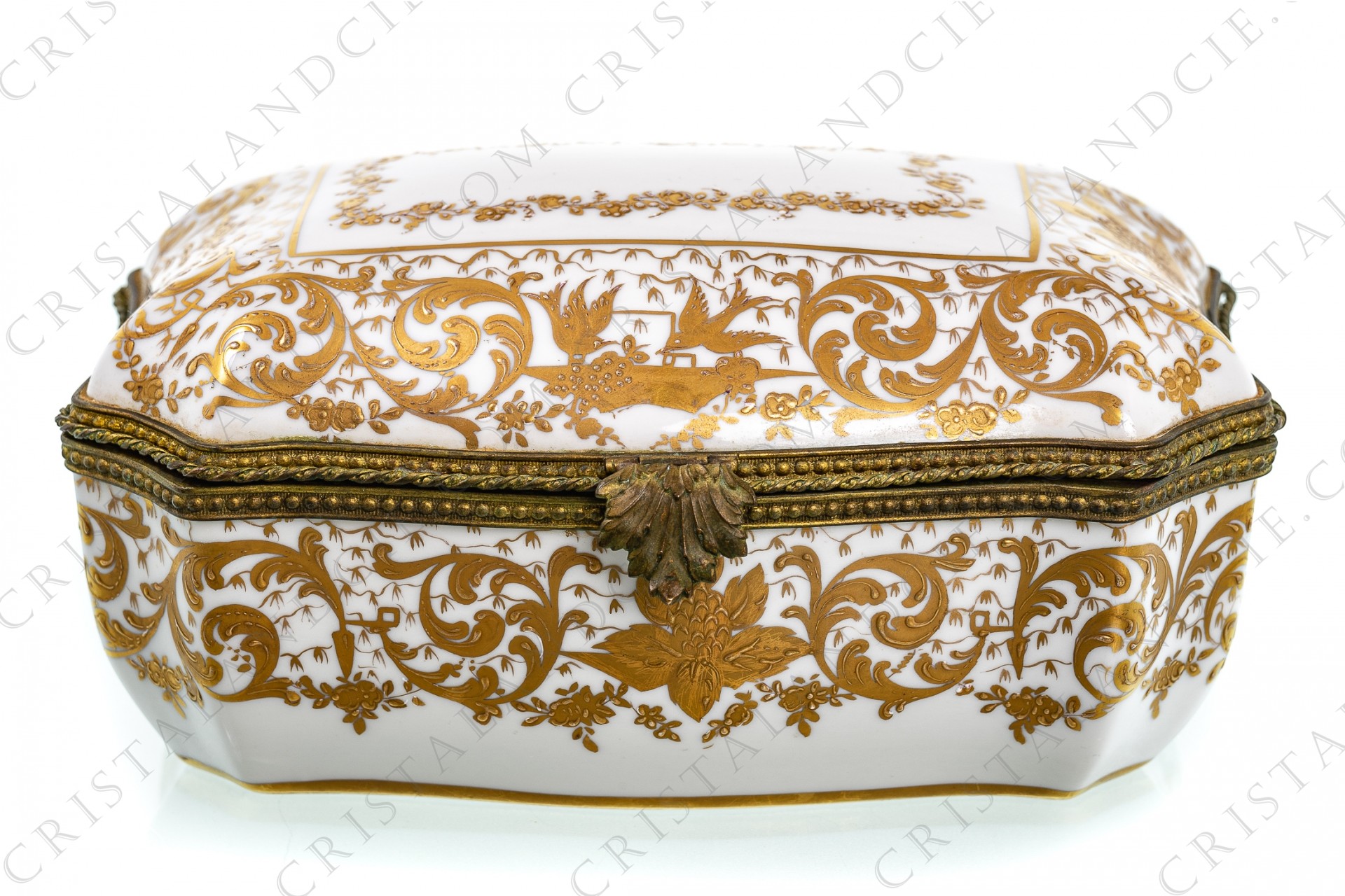 Towering box in china hand decorated by the workshops Le Tallec, decorated with hand painted gold foliages and birds. Frame in brass. Dating from 1963.