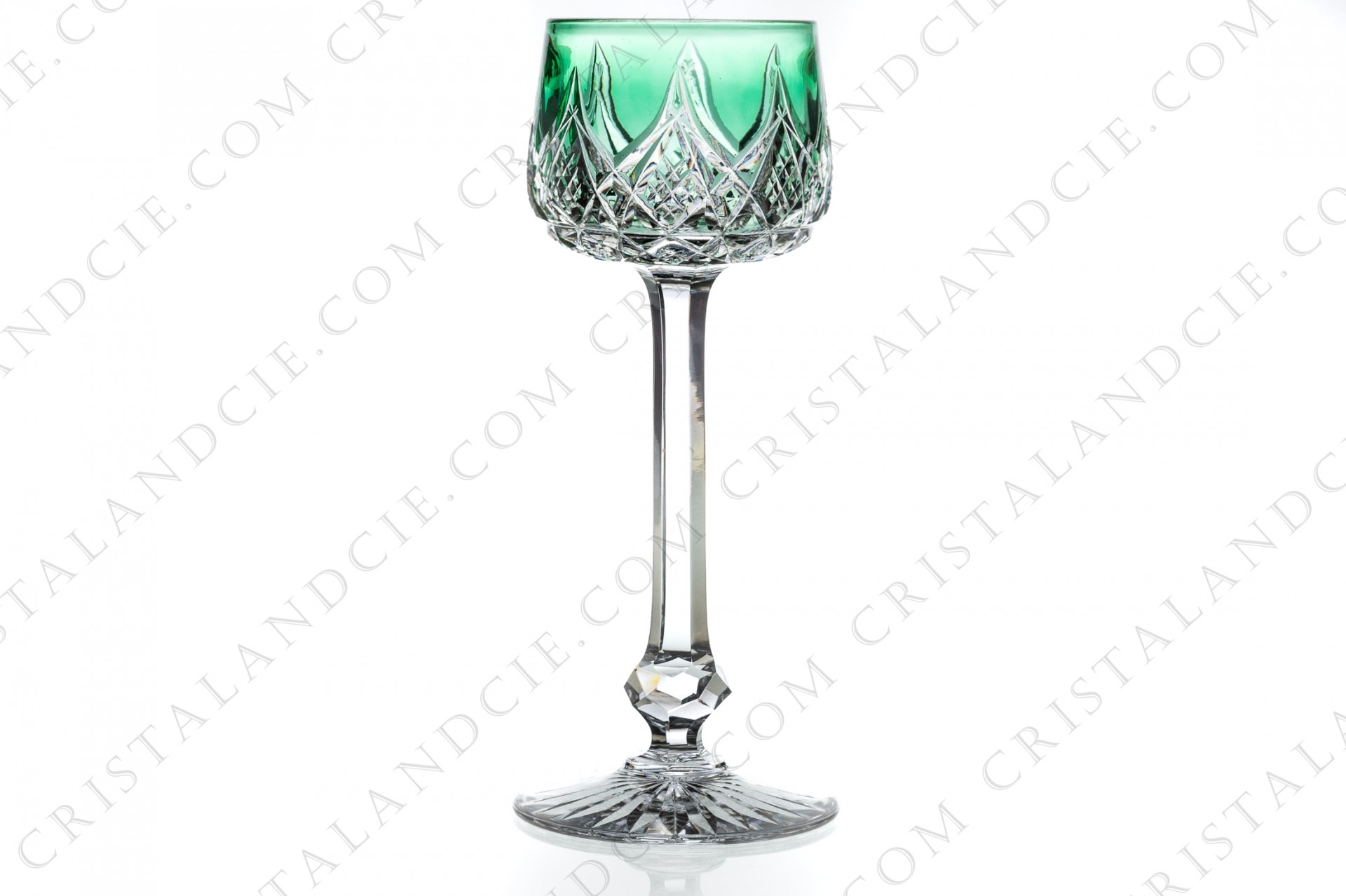 Rhine wine glass hock in green double-layered crystal by Baccarat pattern Colbert with an important carved decor. Pattern produced from 1902 to 2002.