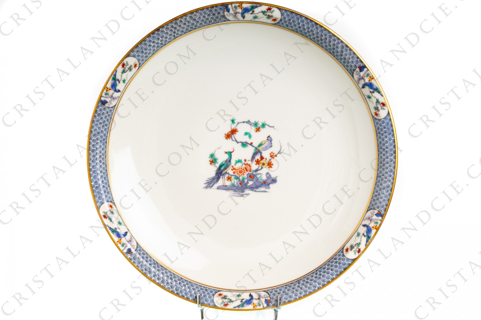 Large round dish in Limoges china by Theodore Haviland pattern Ambazar, decorated with birds of paradise on branches and with gold borders. Dating from the 1900's.