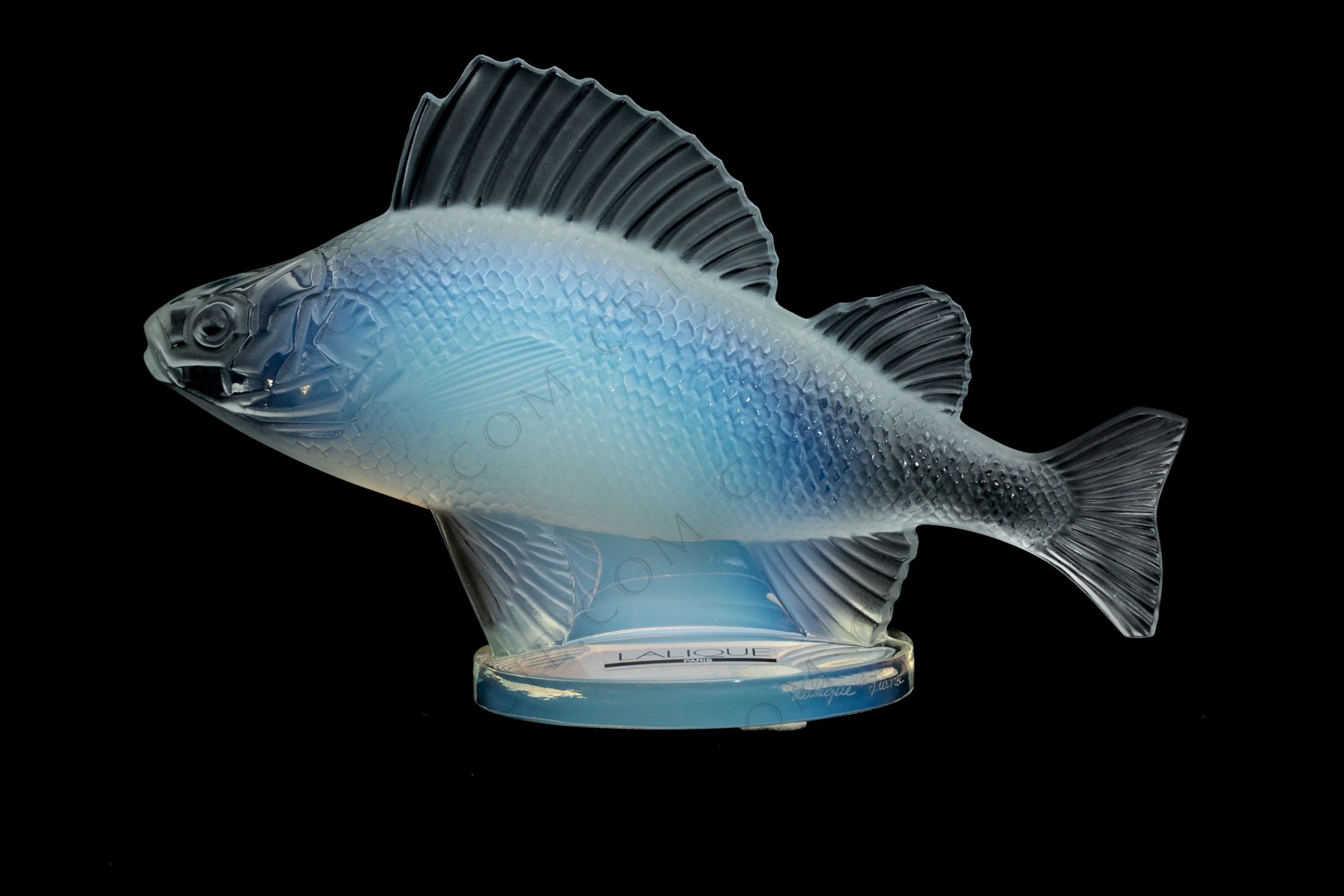 Paperweights in opalescent crystal by Lalique pattern Perche. Pattern created by René Lalique on April 20th, 1929. Excellent condition. Height: 3,66 in Lendth: 6,14 in Diameter: 2,60 in.