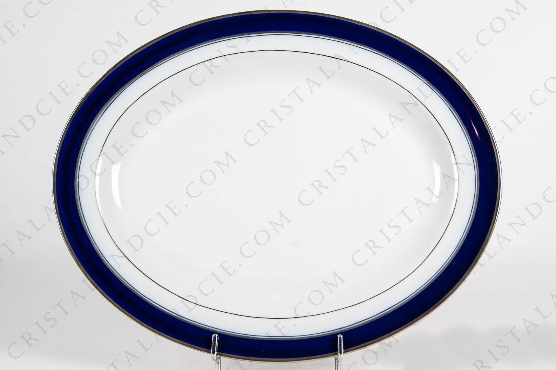 Oval platter in Limoges china by Bernardaud pattern platinum Pavie, decorated with cobalt blue and platinum friezes.