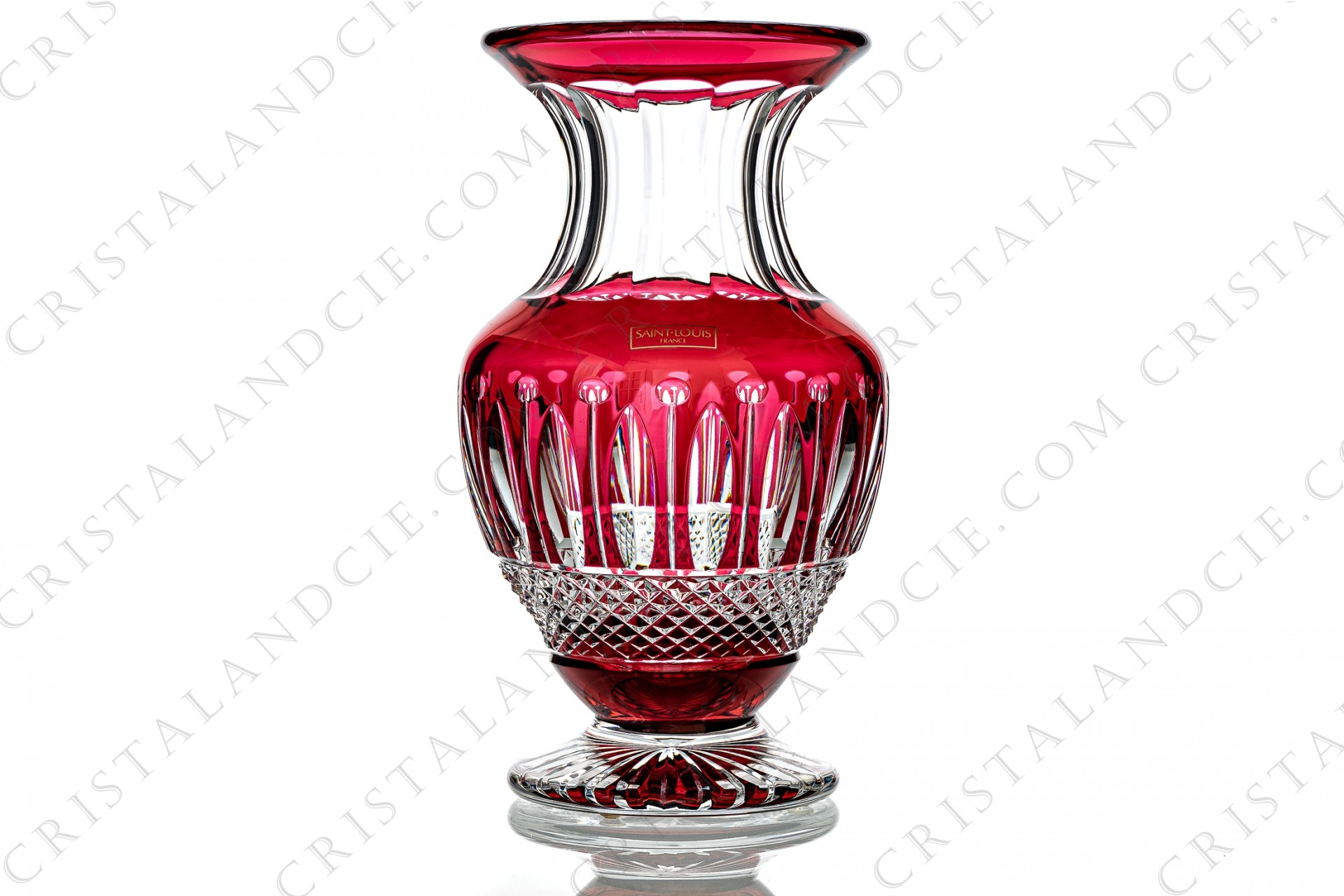 Vase in red double-layer crystal by Saint-Louis pattern Tommy with an important cut pattern. Pattern created in 1928. Stamped, sticker Saint-Louis.
