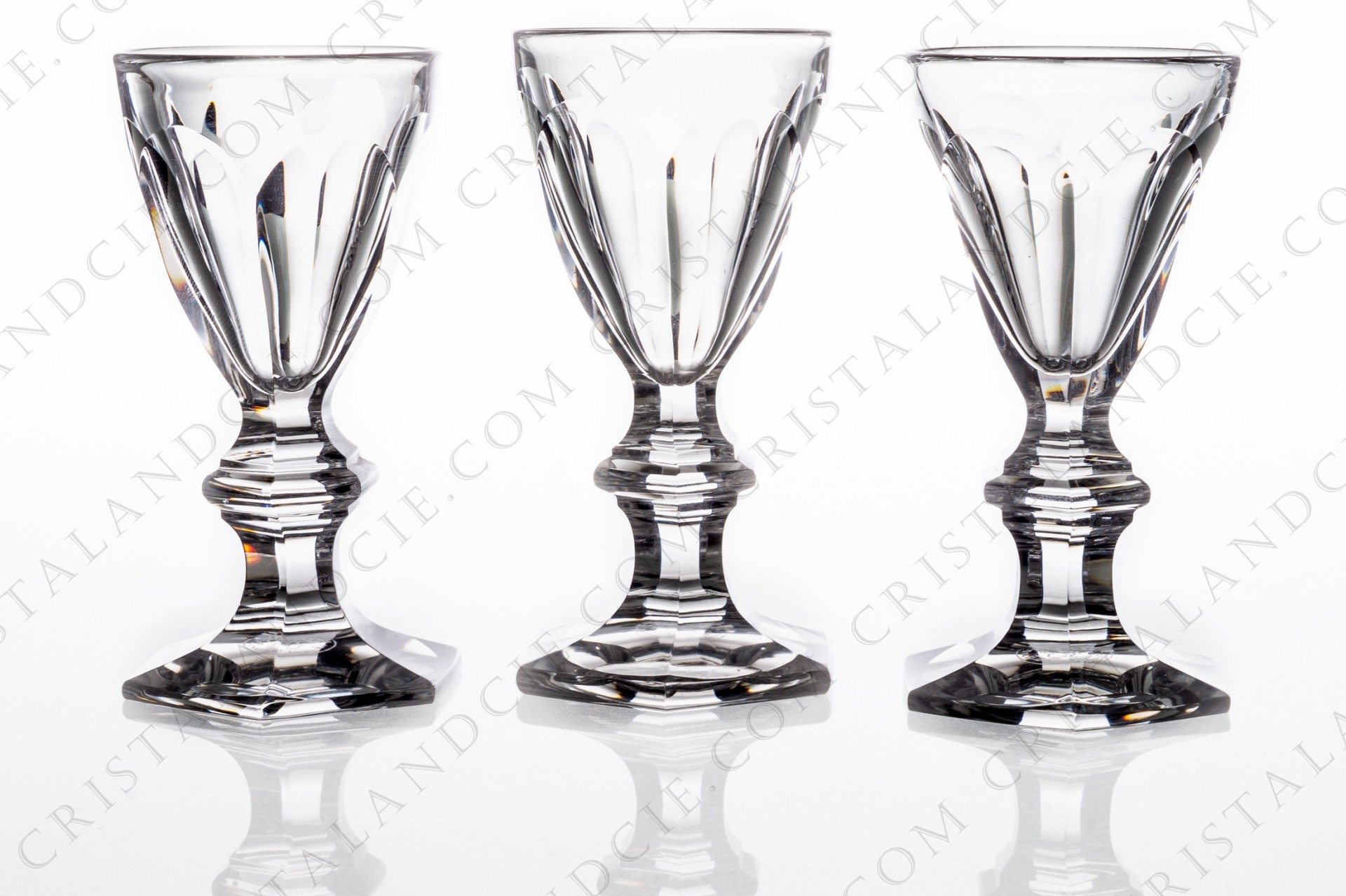 Set of three cordial glasses n°6 in crystal by Baccarat pattern Harcourt decorated with flatcut. Excellent condition. Height: 3,70 in Diameter: 1,85 in.