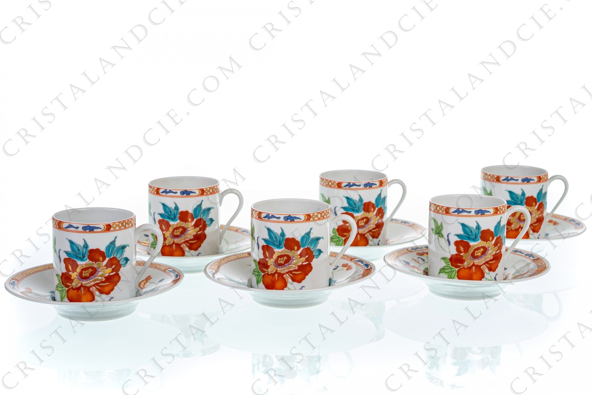 Set of six coffee cups in Limoges china by Raynaud pattern Hokusai decorated with gold and polychrome flowers.