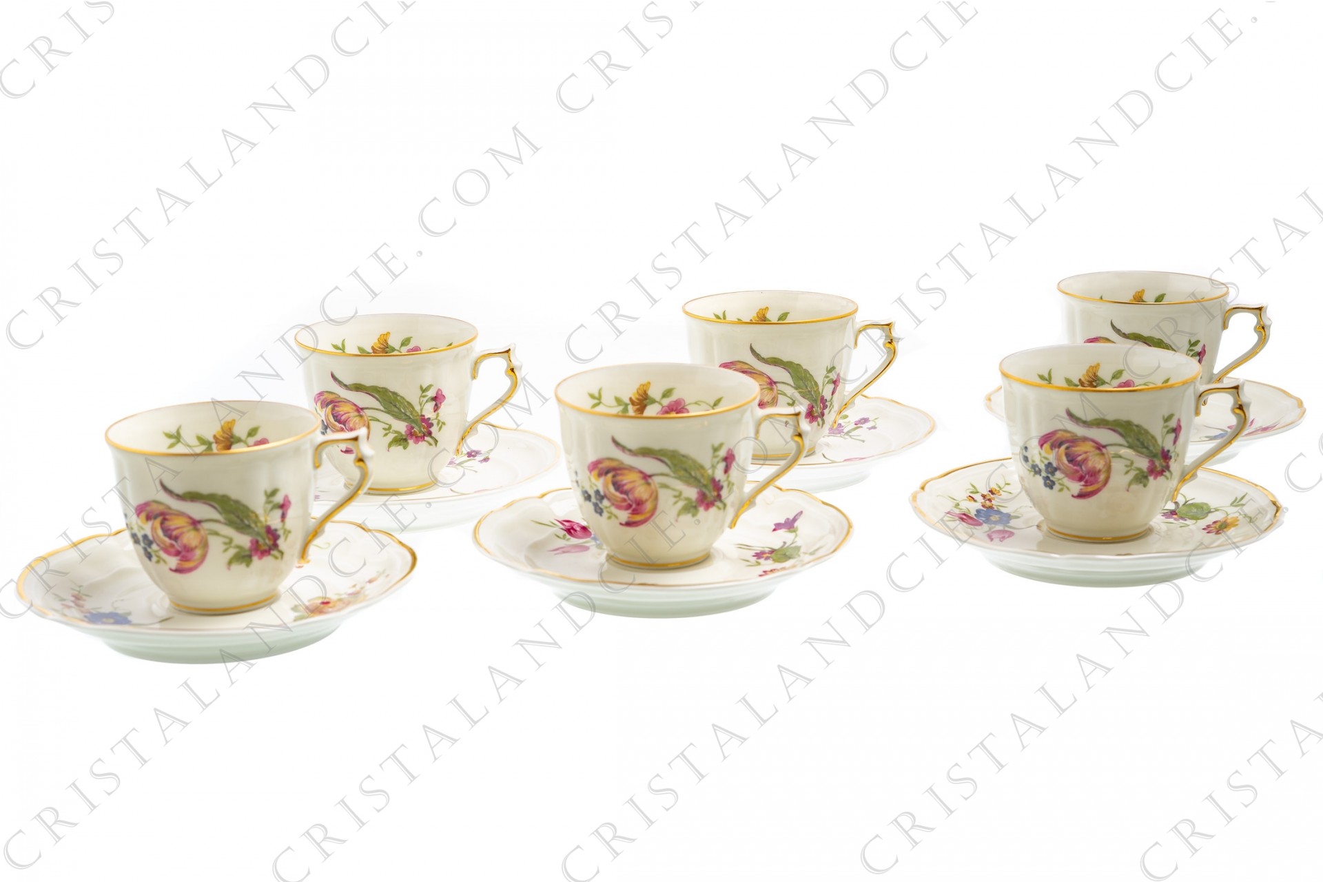 Set of six coffee cups in china of Limoges by Bernardaud shape Régence decorated with polychromes flowers.