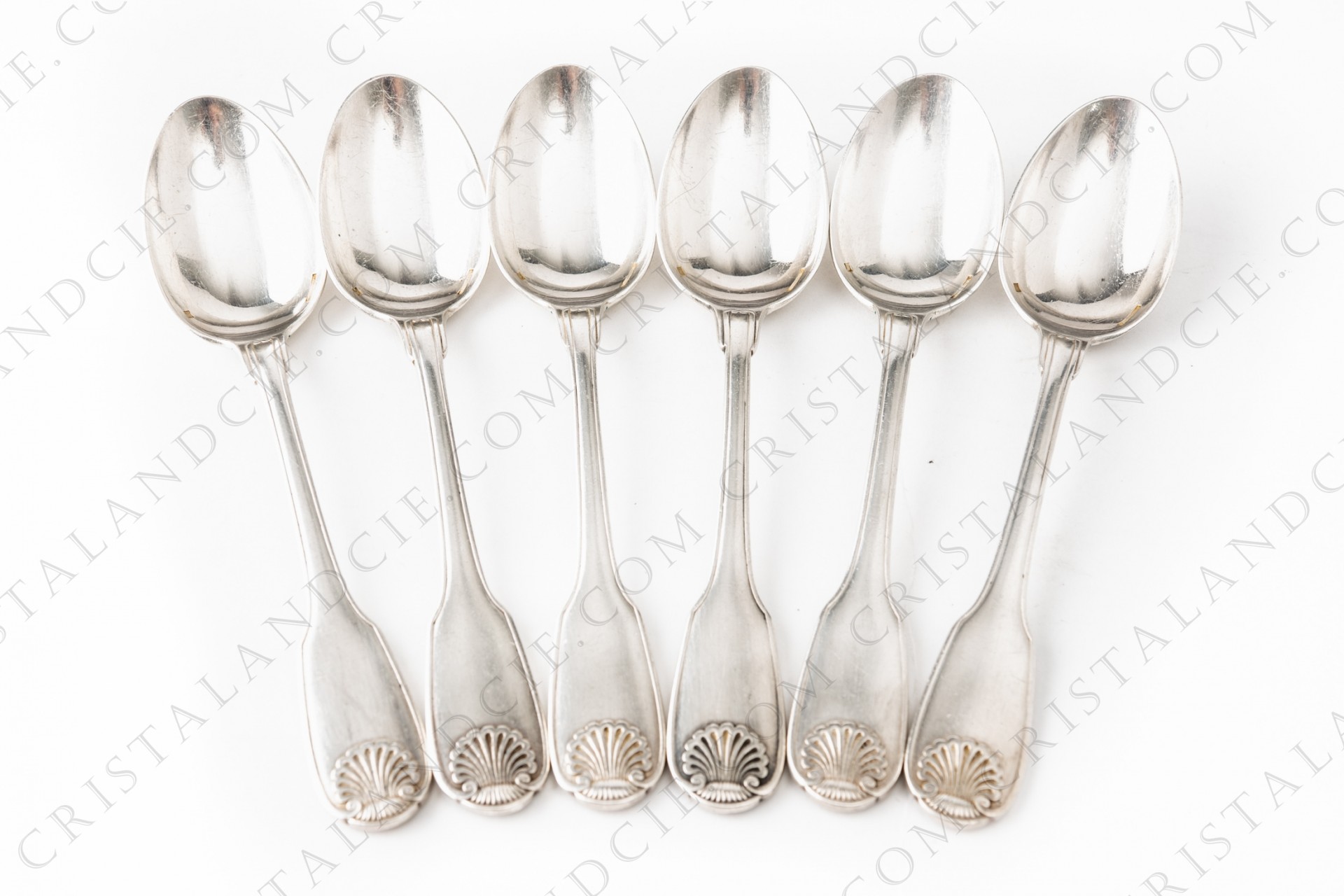 Set of six coffee spoons in platted silver by Christofle pattern Vendôme, decorated with a shell.