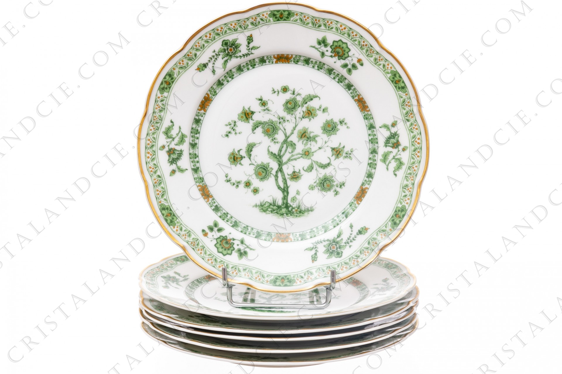 Set of six dessert plates in Limoges china by Haviland pattern Arbre vert shape Lutece decorated with a green and brown flowered tree in the middle, with vegetables friezes and with a gold border.