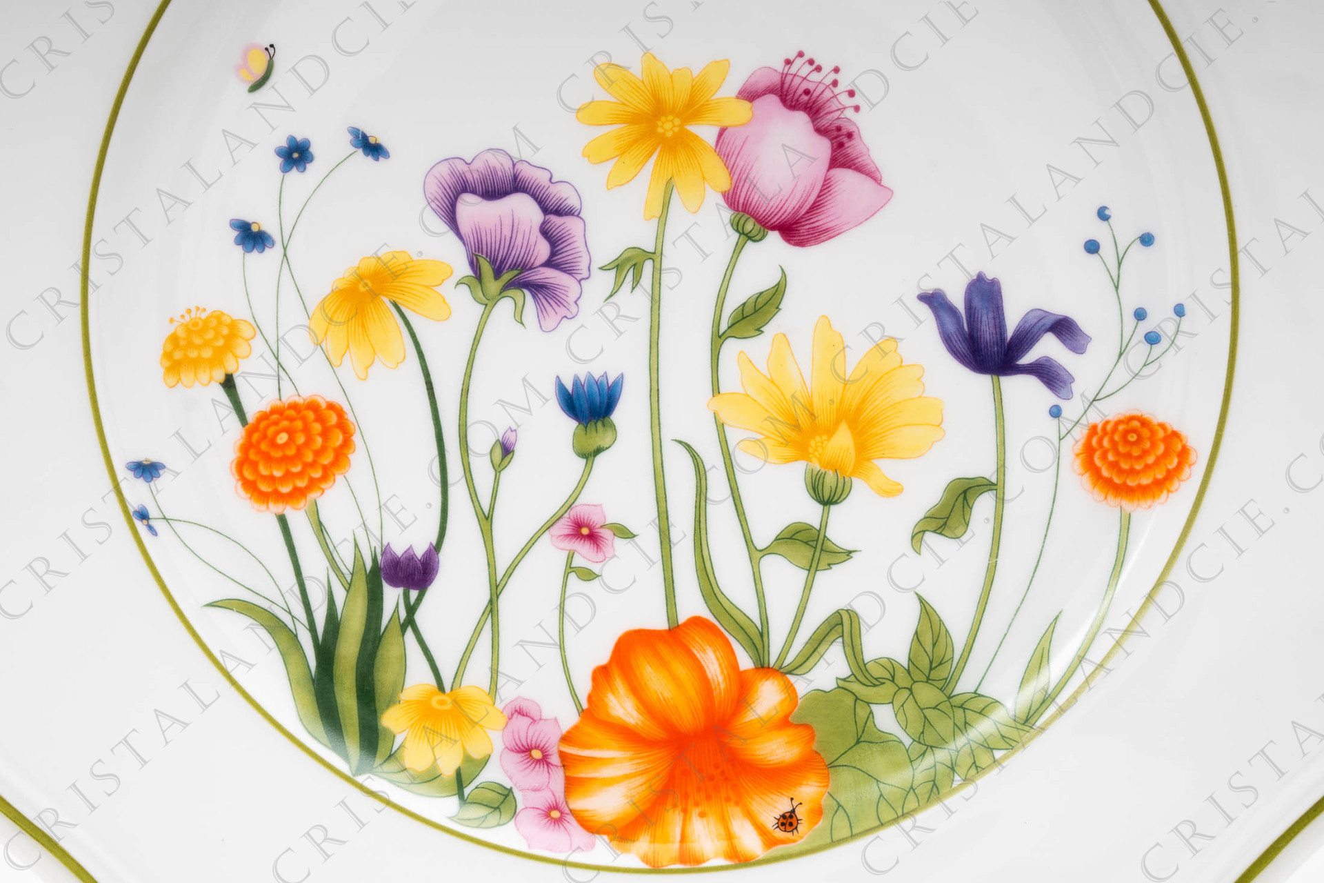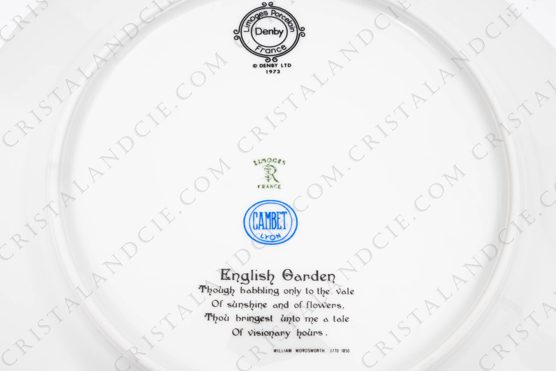 Set of six dinner plates in Limoges china by Raynaud for Denby pattern English Garden decorated with polychromes flowers and bugs.