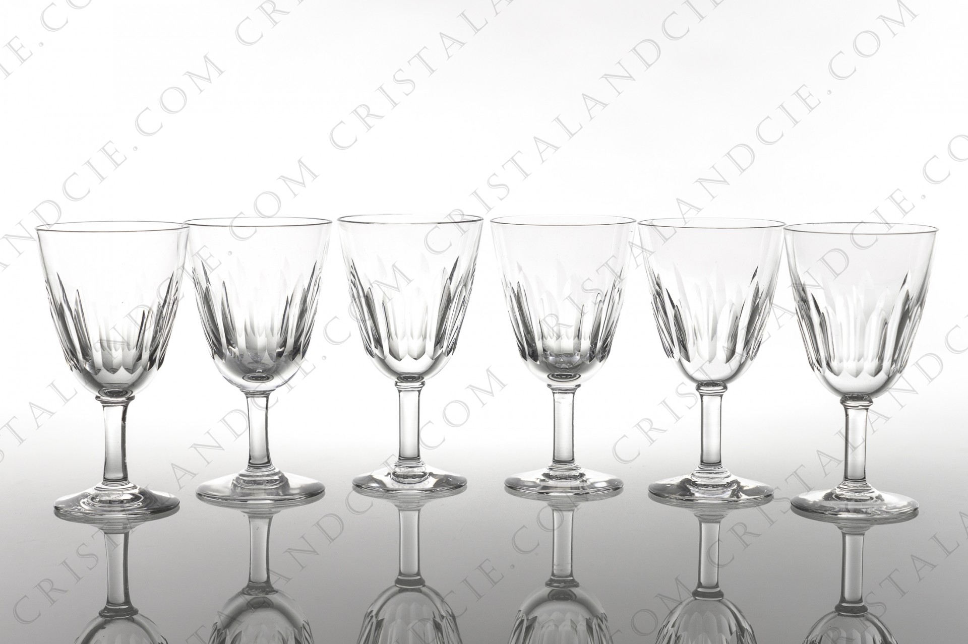 Set of six sherry glasses n°5 in crystal by Baccarat pattern Cassino decorated with cut bevels. Pattern produced from 1953 to 1978. Excellent condition. Height: 4,33 in Diameter: 2,32 in.