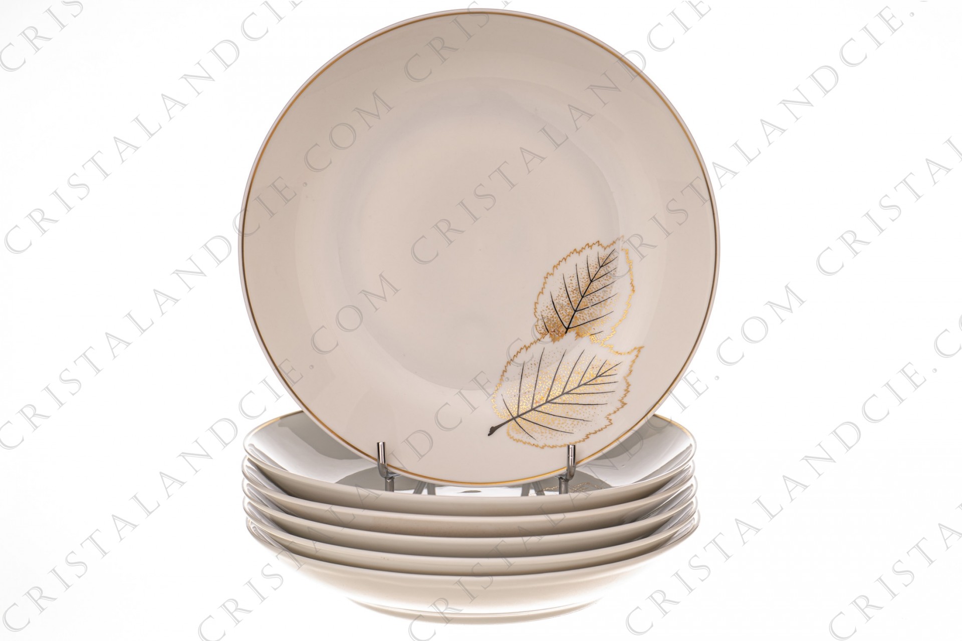 Set of six soup plates in Limoges china by Bernardaud pattern Catherine created by Nicole Desjardin, decorated with gold and black leaves.