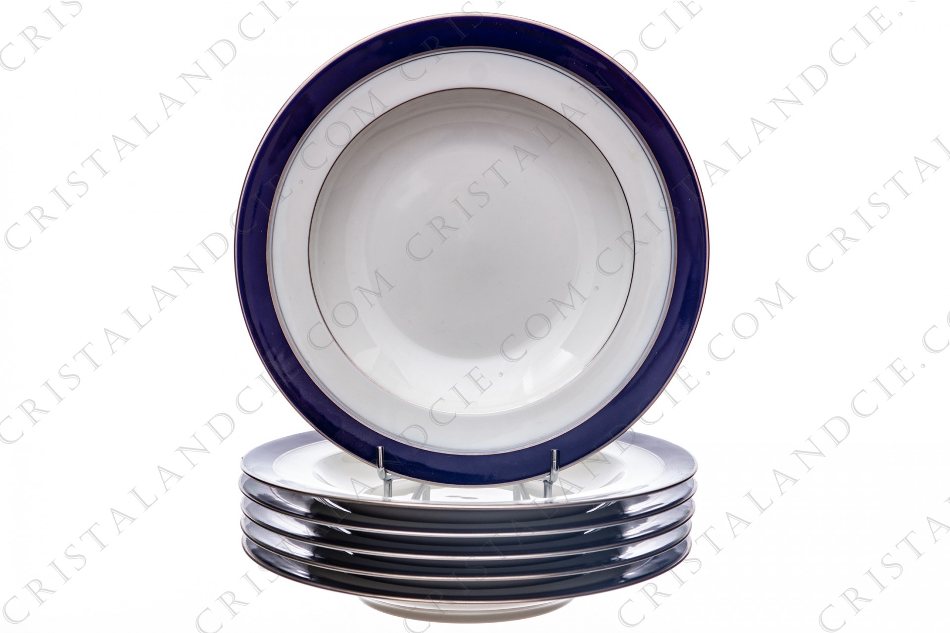Set of six soup plates in Limoges china by Bernardaud pattern platinum Pavie, decorated with cobalt blue and platinum borders.
