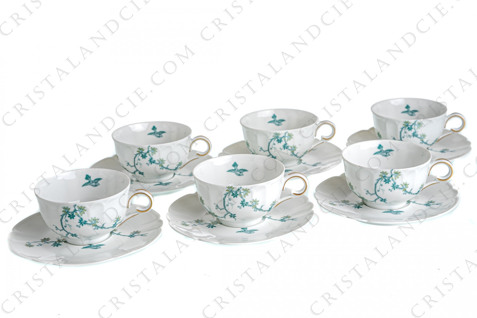 Set of six tea cups in Limoges china by Haviland and Parlon with a blue shades pattern of flowered branches and bird. Pattern signed P. Faure.