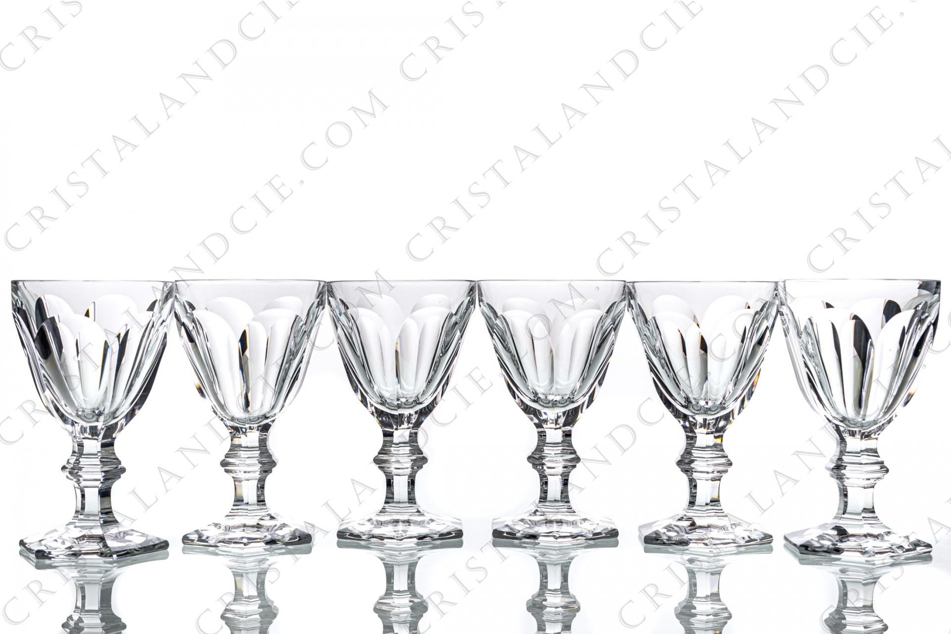 Set of six water glasses n°2 in crystal by Baccarat pattern Harcourt with an important cut pattern. Pattern created in 1841, still made. Stamped.