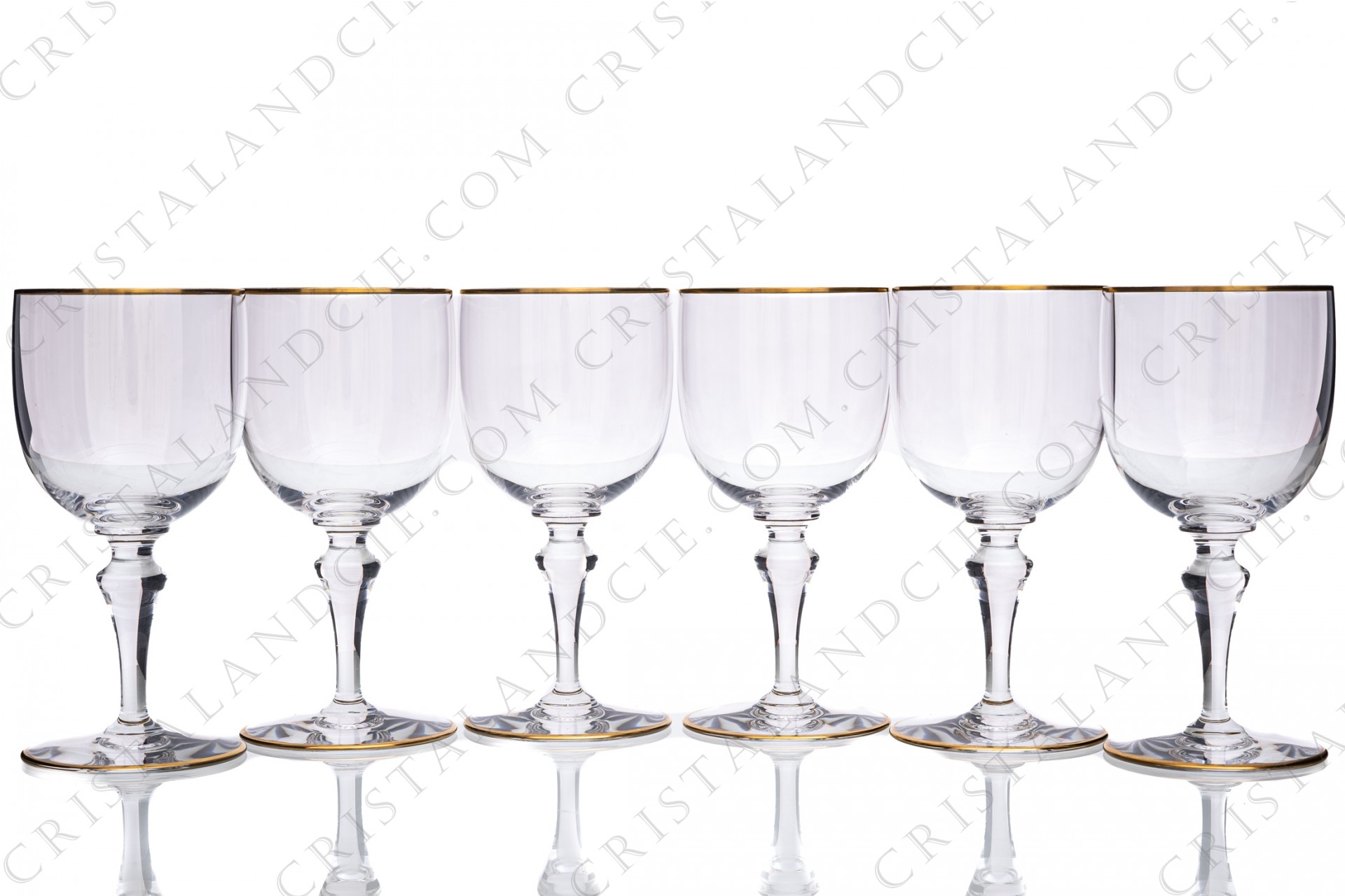 Set of six water glasses n°2 in crystal by Baccarat pattern Mahora decorated with gold borders. Stamped.