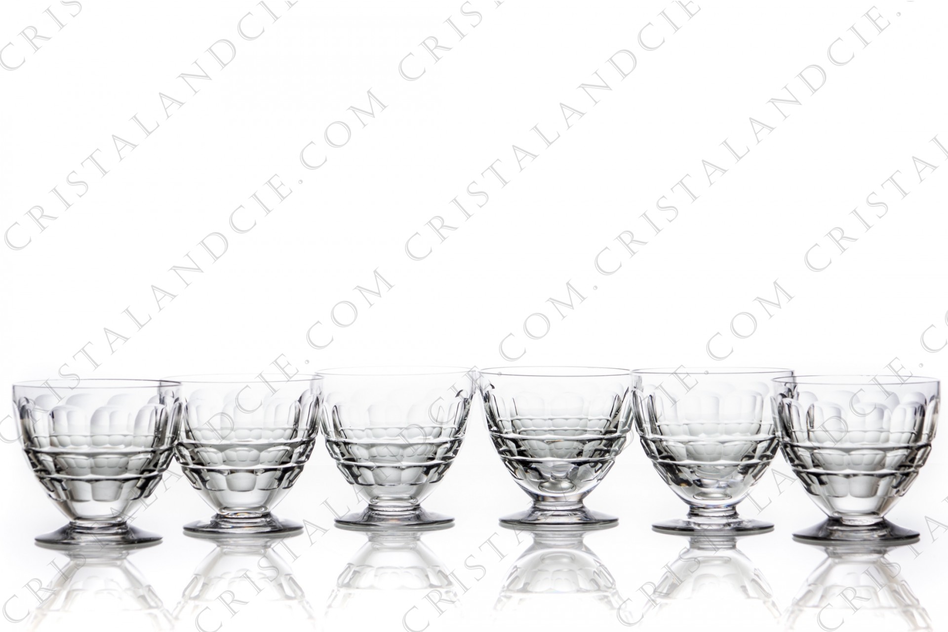 Set of six wine glasses n°4 in crystal by Baccarat pattern Charmes with a cut pattern on the parison. Pattern produced from 1934 to 1961. Rares tiny scratches. Height: 2,72 in Diameter: 2,91 in.
