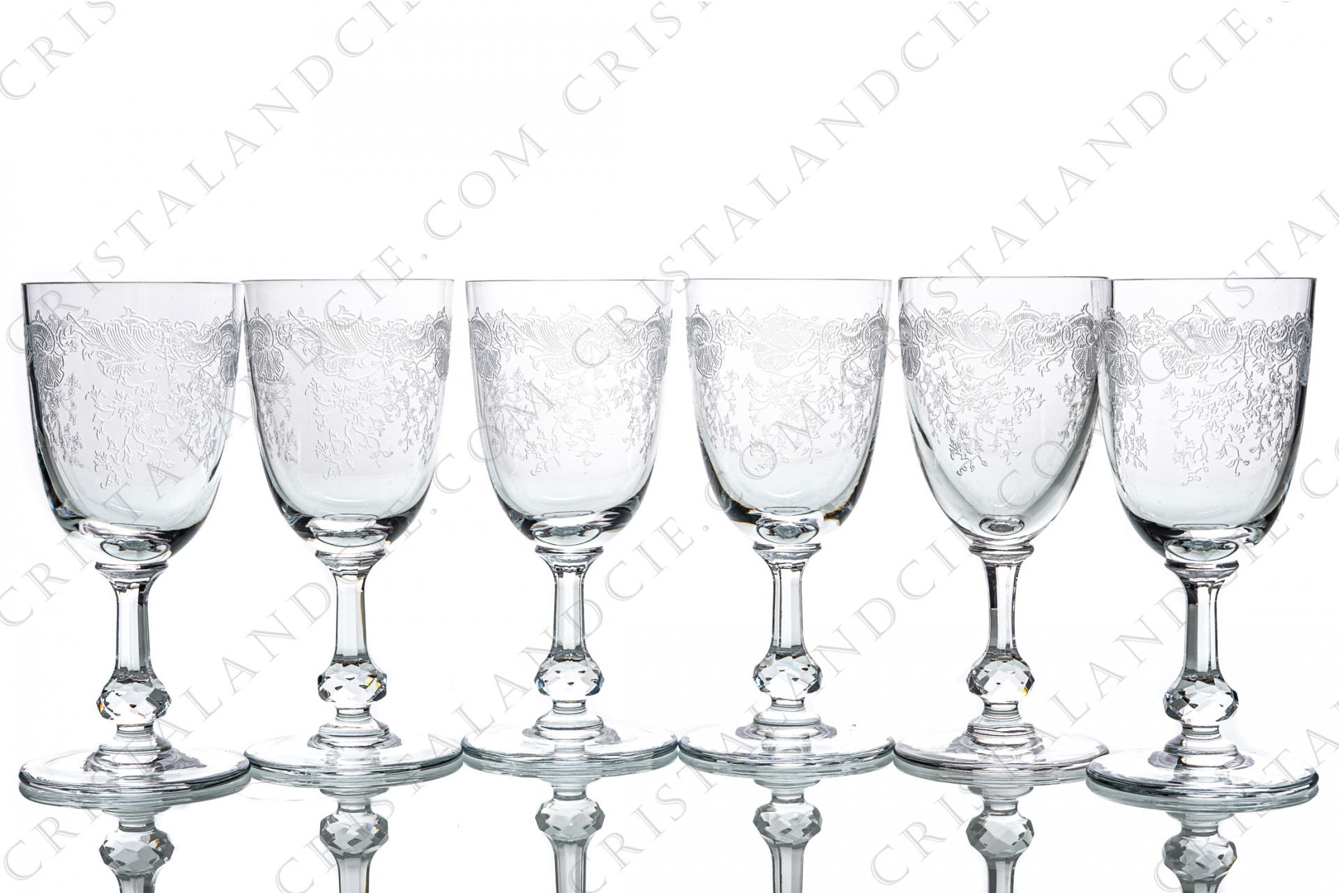 Set of six wine glasses n°3 in crystal by Saint-Louis pattern Cléo with an engraved pattern of arabesques and foliage, collar with facet on the stem. Pattern created in 1903. Stamped.