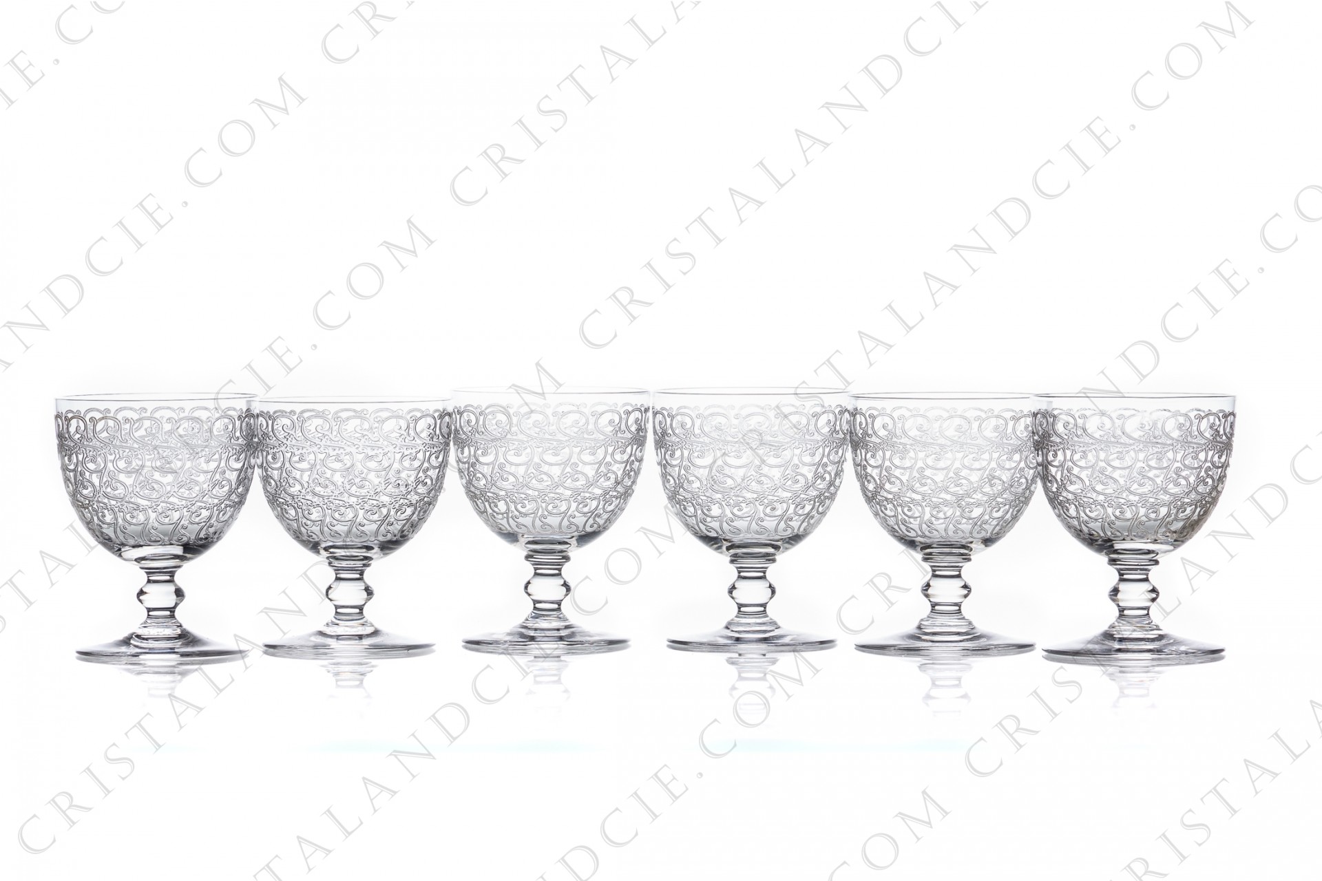 Set of six wine glasses n°4 in crystal by Baccarat pattern Rohan with an important engraved pattern and a ring on the stem. Rares tiny scratches. Height: 3,39 in Diameter: 2,68 in.