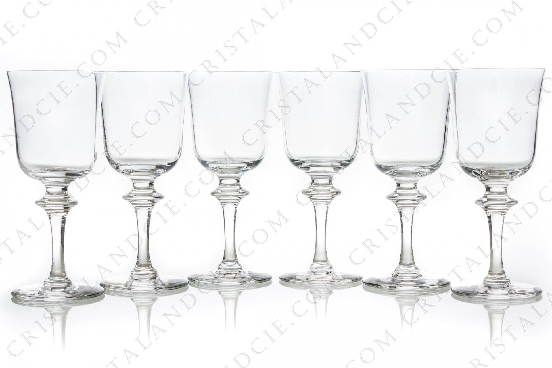 Set of six wine glasses n°4 in crystal by Daum pattern Saumur decorated with a ring on the stem. Rares tiny scratches. Height: 5,98 in Diameter: 2,64 in.