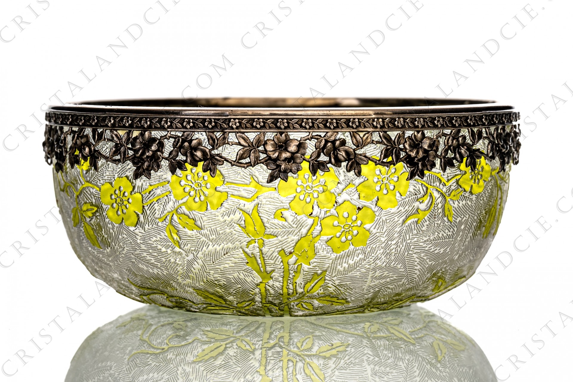 Small bowl in yellow double layer crystal by Baccarat pattern Eglantiers with a pattern of wild roses in yellow crystal and a clear engraved with the acid background. Frame in plated silver. Too old to be stamped.