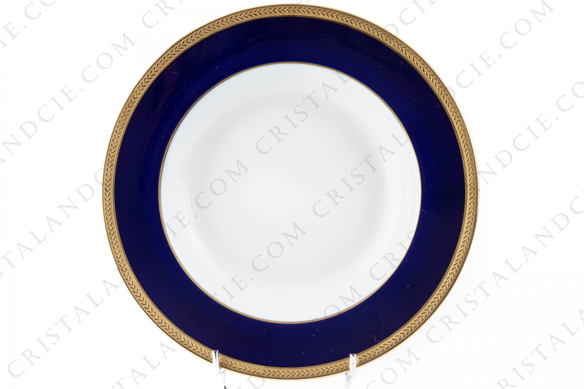 Soup plate in Limoges china by Bernardaud pattern Palaiseau, decorated with cobalt blue frieze and gold inlays.