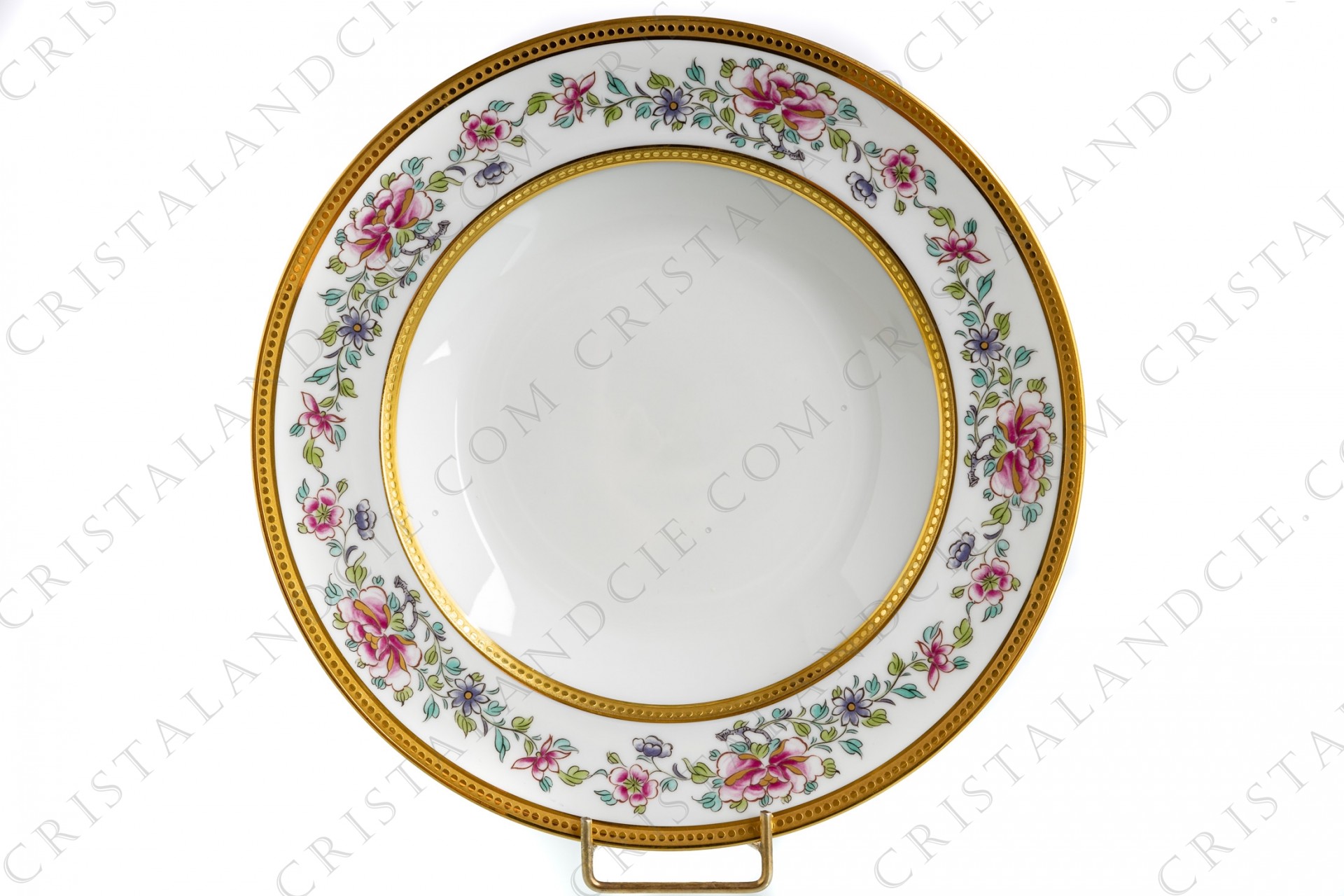 Soup plate in Limoges china by Bernardaud pattern Villaris, decorated with gold inlays and polychrome flowers.