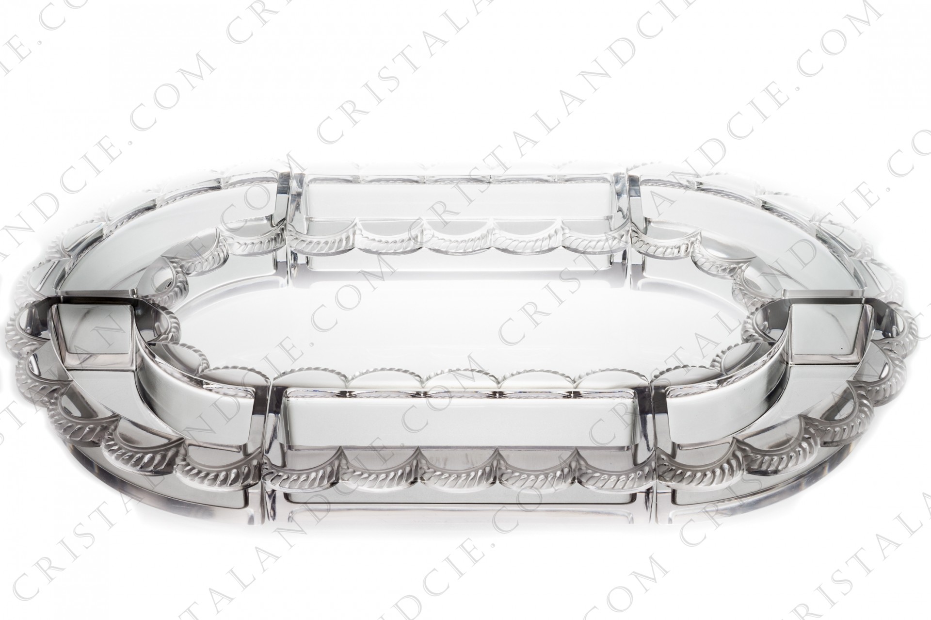 Table centerpiece in crystal by Lalique pattern Festons. Including four curved parts and two right parts. Pattern created by René Lalique on March 15, 1939.