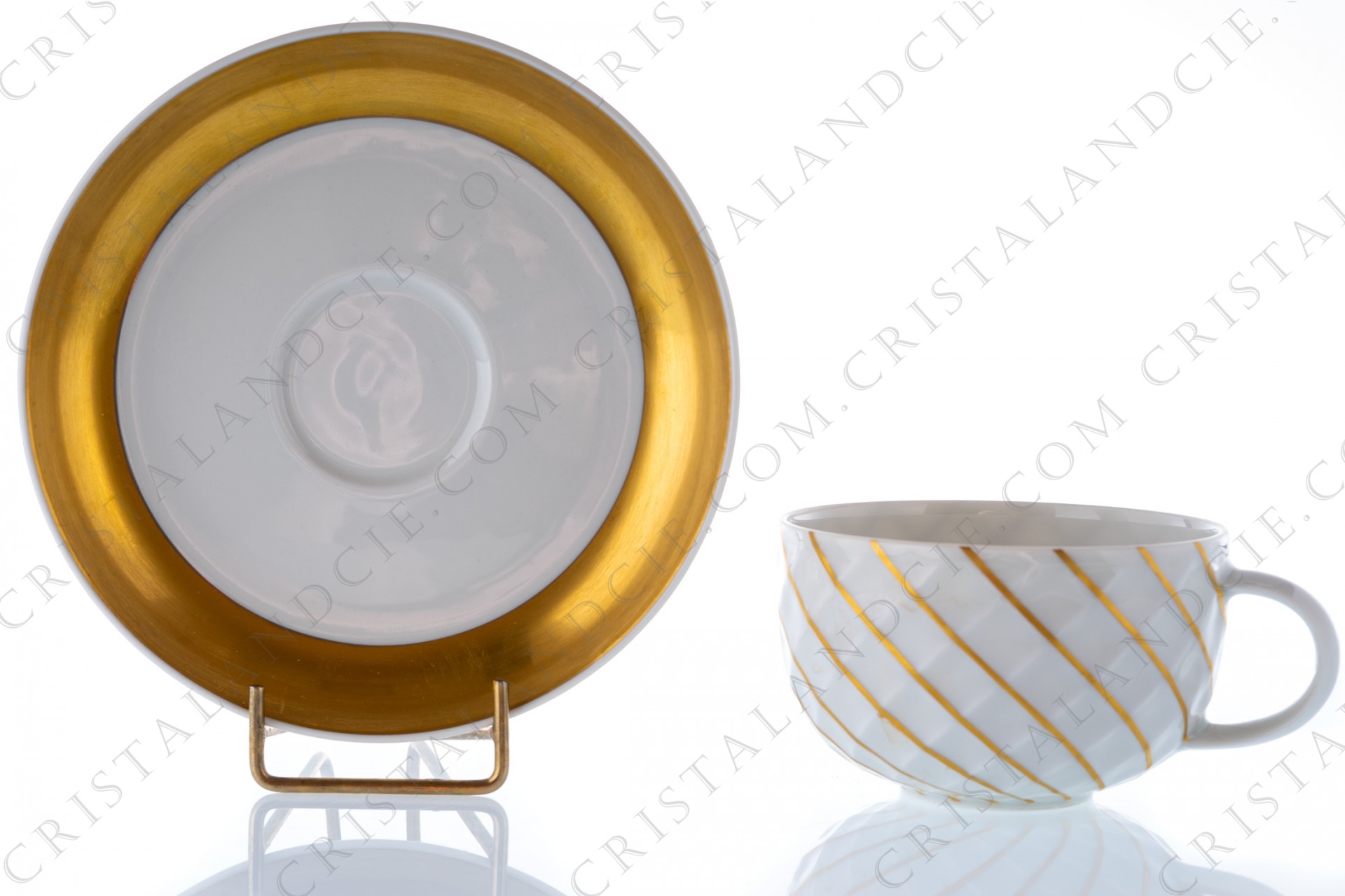 Tea cup in German china by Thomas pattern Holiday in Prague, decorated with a gold enhanced grid on the cup, and a large gold border on the saucer.