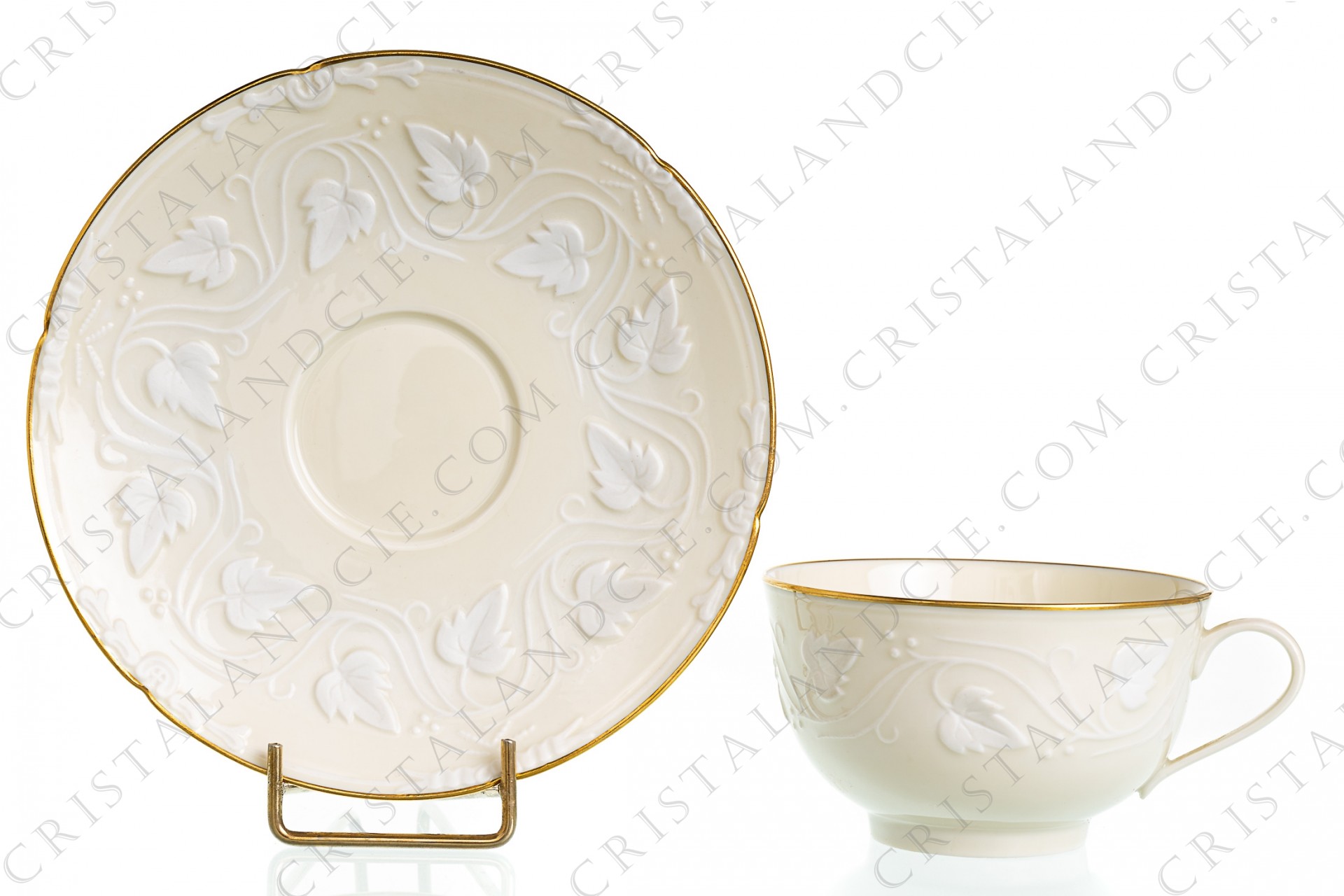 Tea cup in Limoges china by Haviland et Parlon pattern Imperatrice white decorated with ivy leaves in porcelain bisque and gold borders.