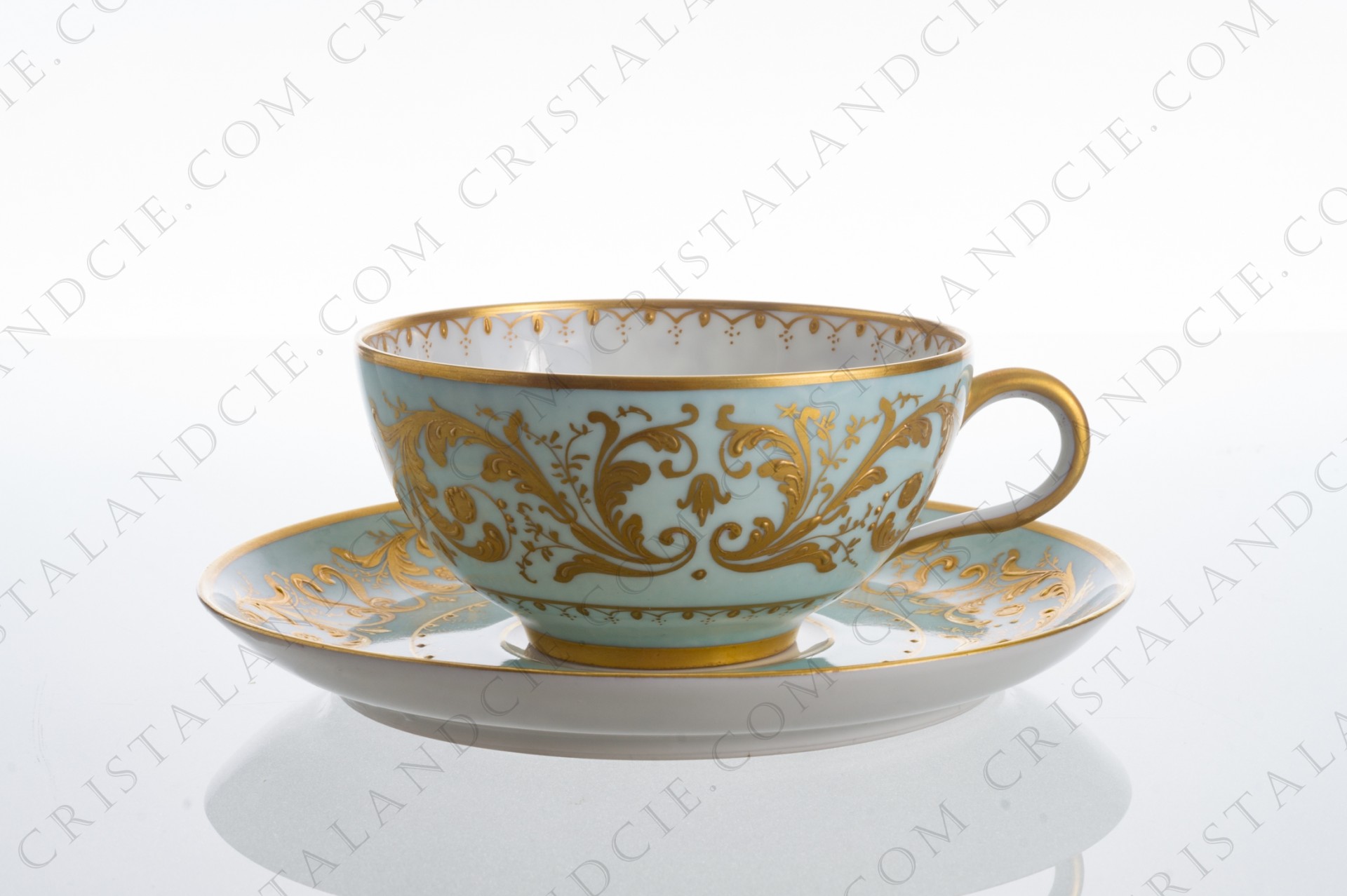 Tea cup in china decorated by the workshop Le Tallec in Paris, with an hand-painted pattern of gold arabesques on a clear green background. From 1960.