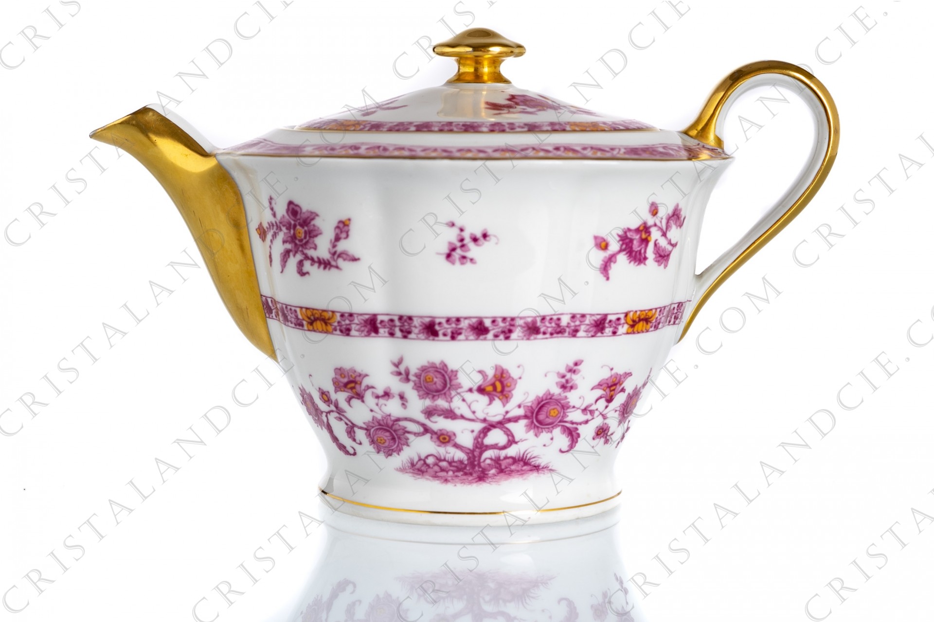 Tea pot in Limoges china by Haviland pattern Arbre pourpre shape Lutece decorated with a purple and yellow flowered tree in the middle, with vegetables friezes and with a gold border.